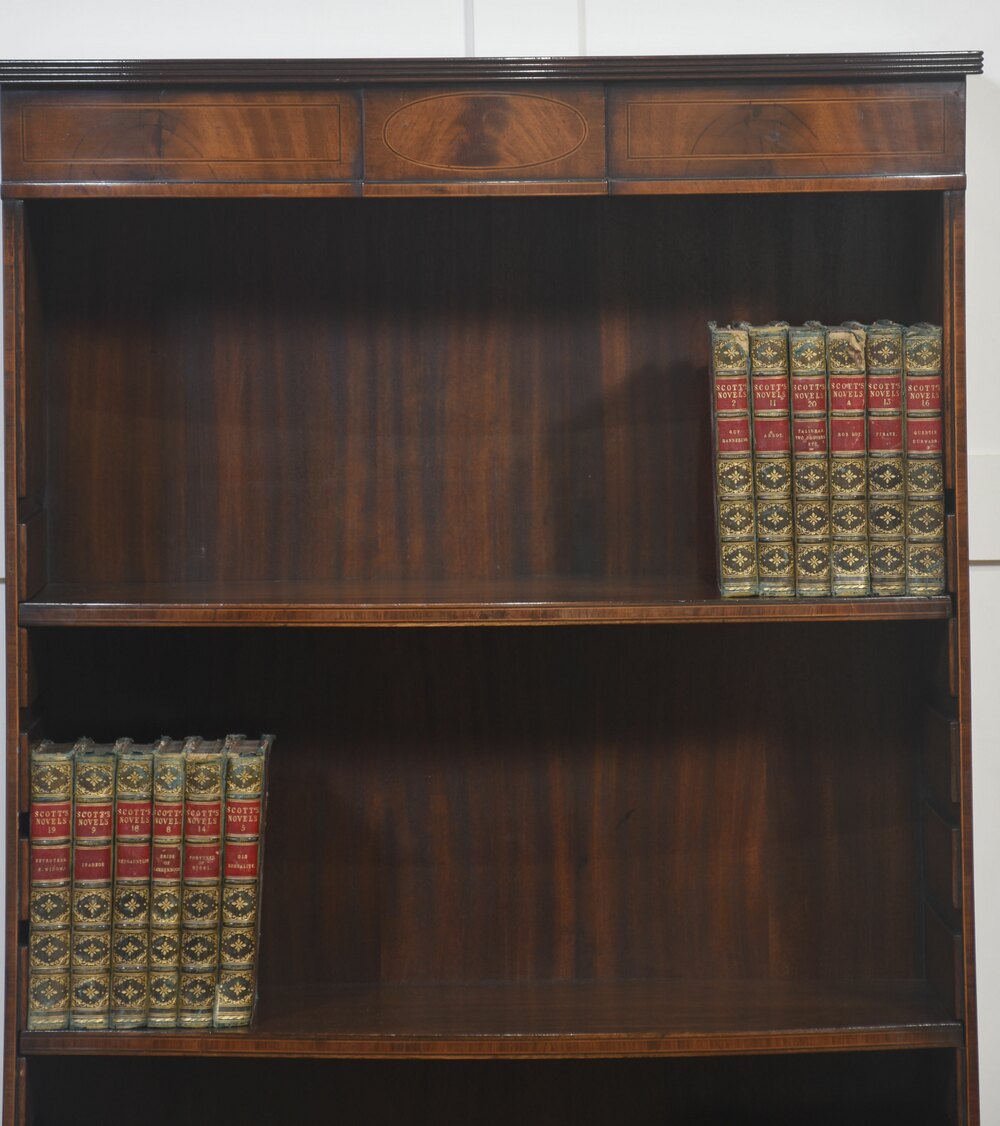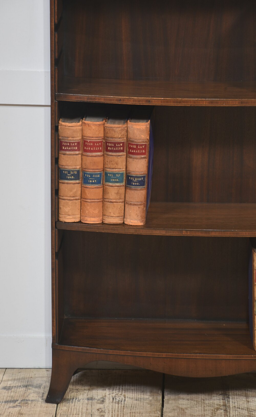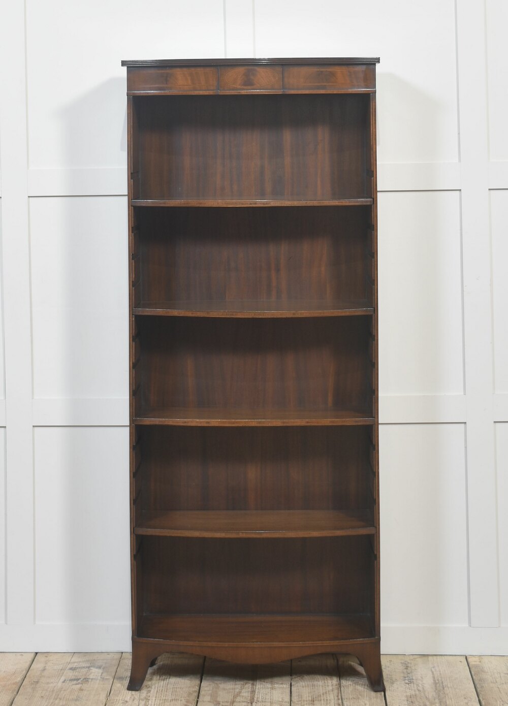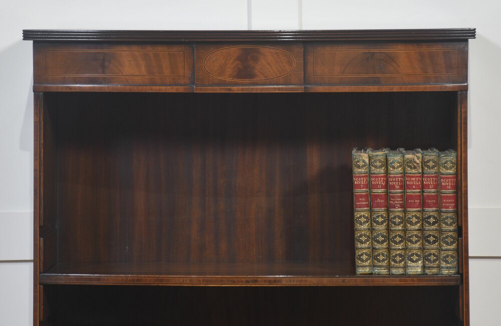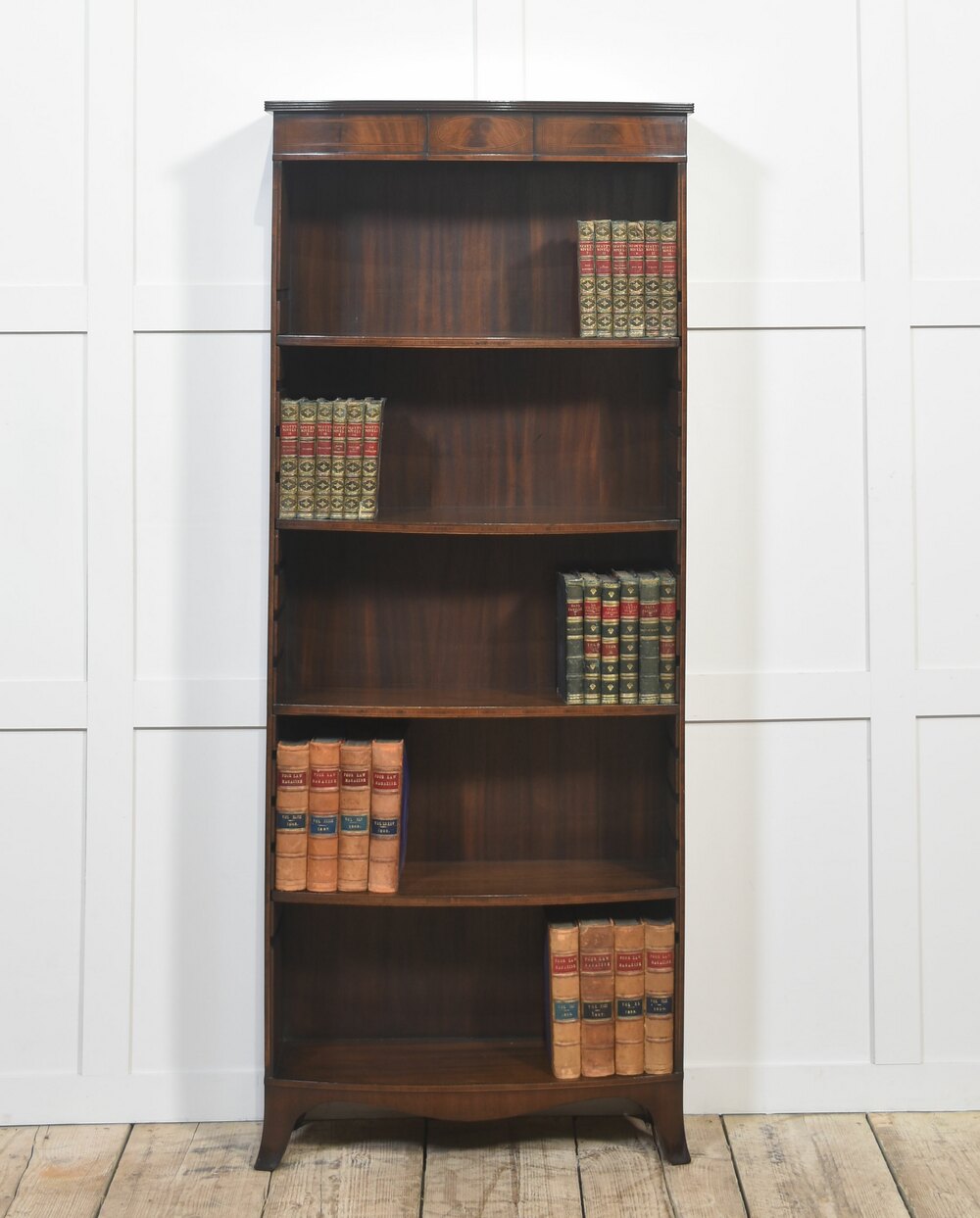fine quality antique mahogany open bookcase, dating from the early 20th century. Of elegant design, it features four adjustable shelves offering generous storage for books or display pieces. The rich mahogany grain is beautifully figured, complemented by simple inlay detailing to the frieze.