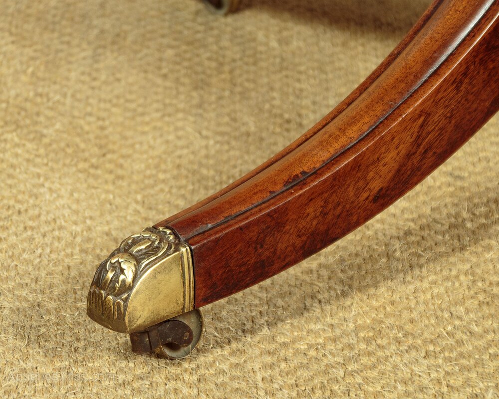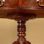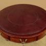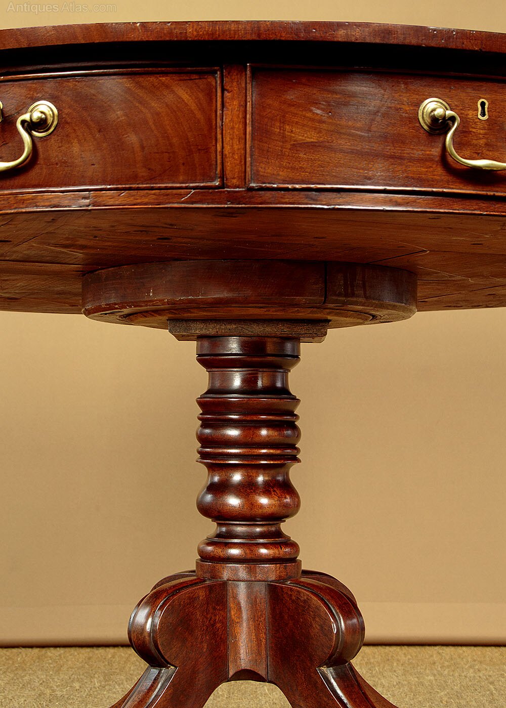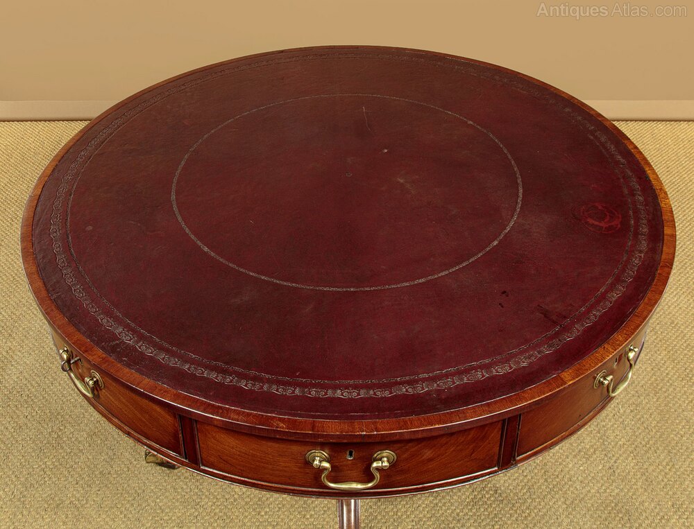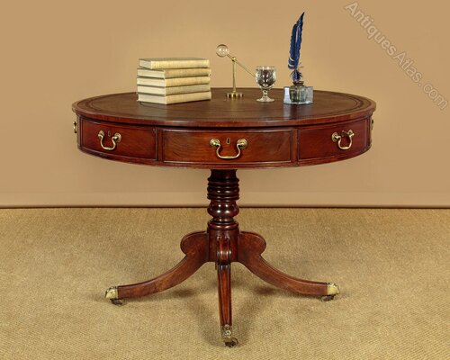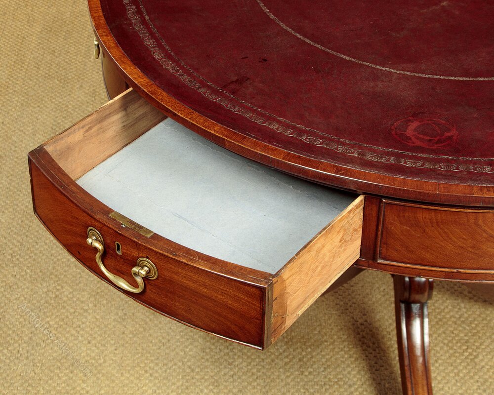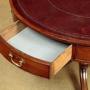 Lovely quality mid 19th.c. circular mahogany library table or drum table c.1880. 43" diameter top with the original burgundy tooled leather work surface within a crossbanded border. With four working and lockable drawers alternating with dummy drawer fronts. Solid mahogany drawer fronts with cockbeaded edges and brass swan neck handles. Table top revolves with a smooth action on a crisply turned solid mahogany column. Raised on four swept and moulded legs with brass toes and castors. Some minor old marks and wear to the leather, otherwise excellent colour and condition, cleaned and waxed in our workshops. Keys supplied.