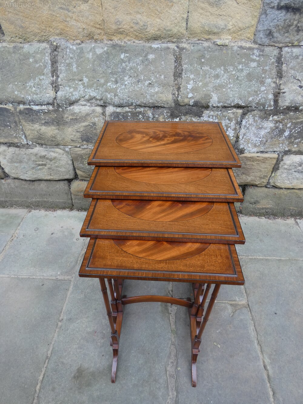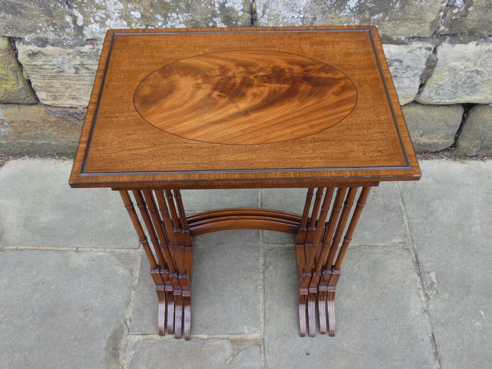 Very good quality mahogany nest of four antique tables circa 1890 with inlaid and crossbanded tops raised on elegant turned legs with curved stretchers and ebony inlaid feet.