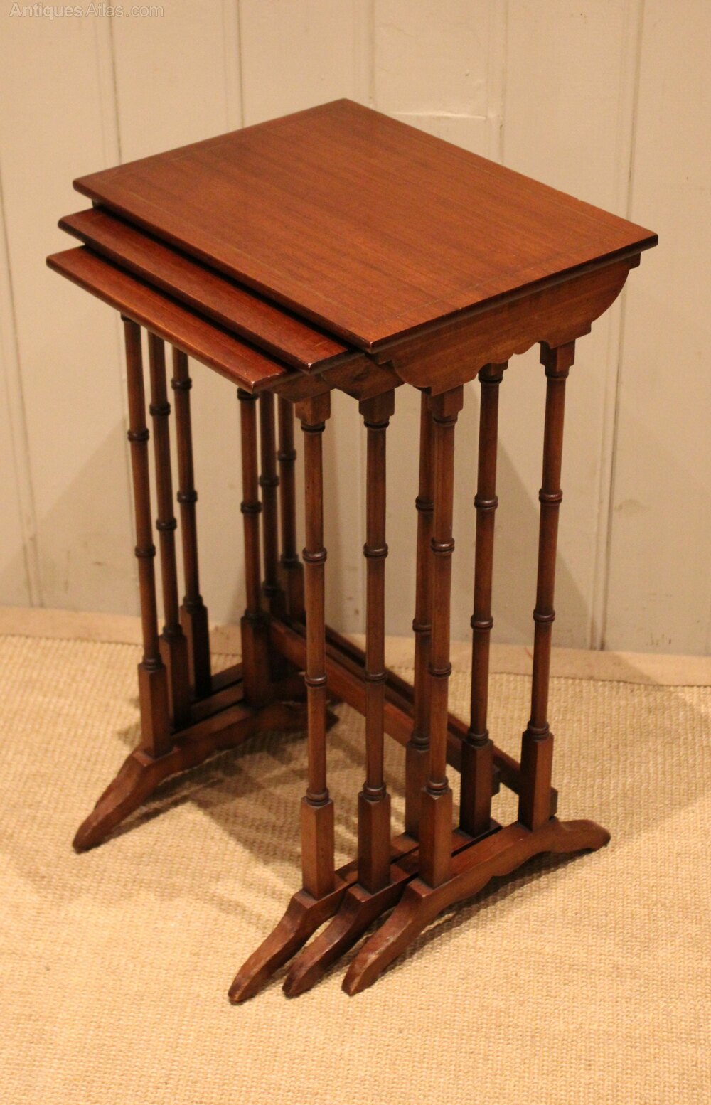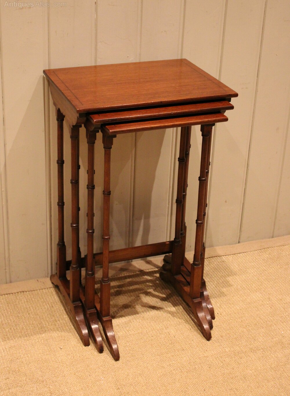 Edwardian mahogany nest of three tables having rectangular tops , raised on turned supports with shaped feet joined by a rear stretcher . The middle table measures 58 cm high , 31.5 cm wide and 26 cm deep and the small table 56 cm high , 26.5 cm wide and 24 cm deep .