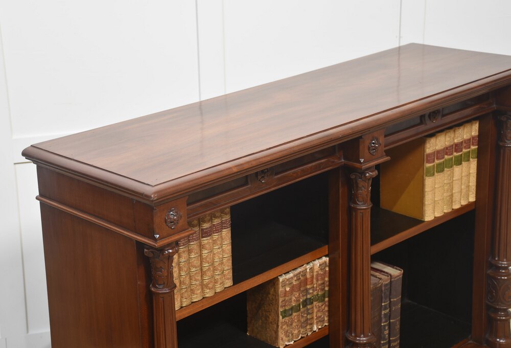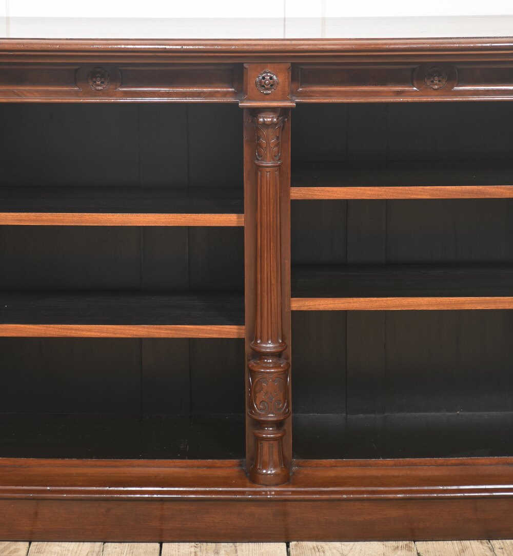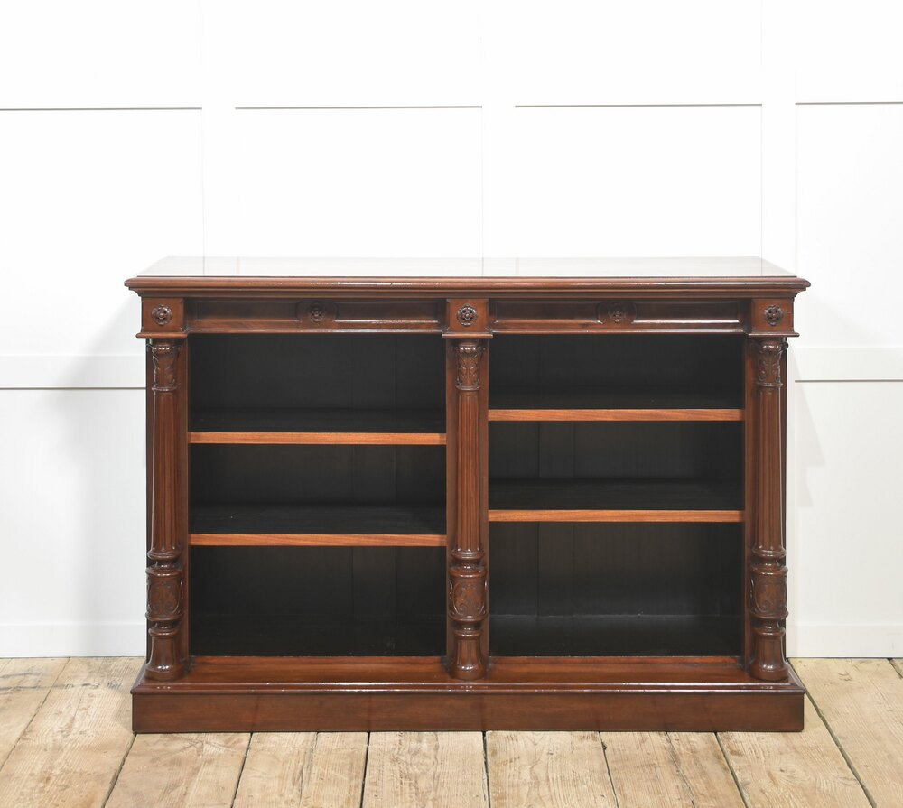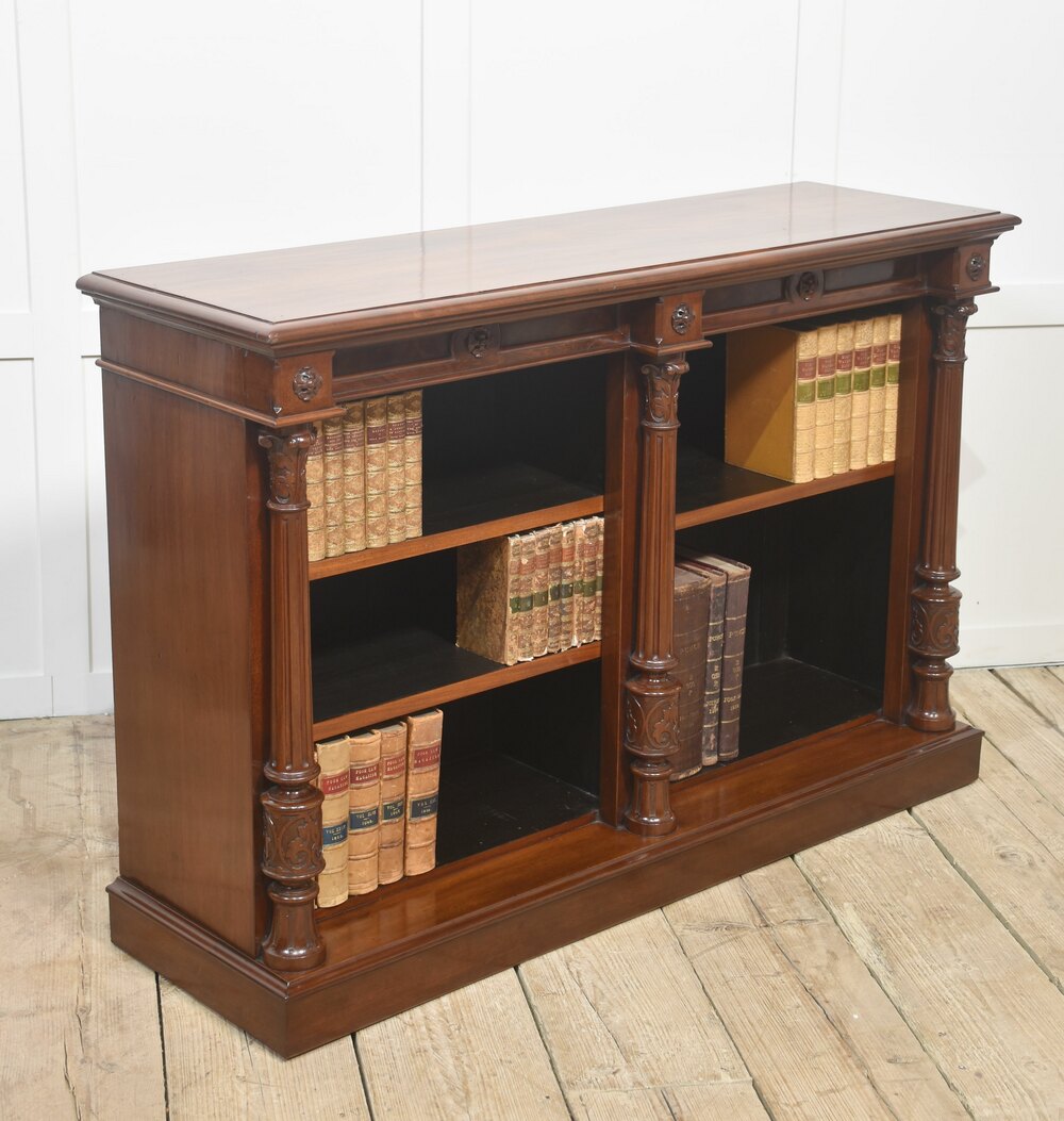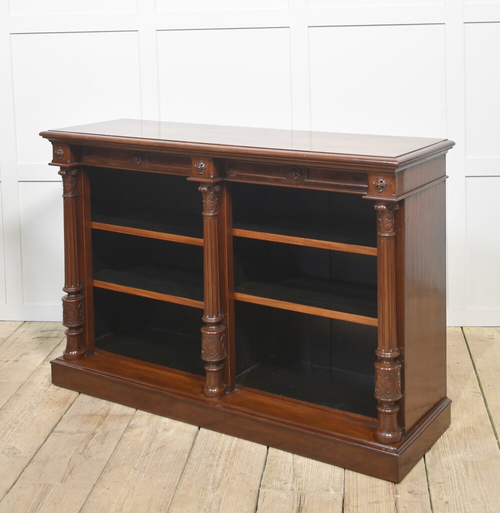 19th-century mahogany open bookcase, the rectangular top above two bays of adjustable shelves divided by turned columns. All raised up on plinth base.