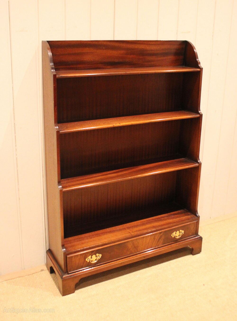 Mahogany open bookcase having four graduated shelves and a drawer to the base , raised on bracket feet . The shelves are 70 cm wide and from the bottom up 26.5 cm high x 20 cm deep , 23 cm high x 17 cm deep , 20 cm high x 15 cm deep , and the top shelf is 12 cm deep .