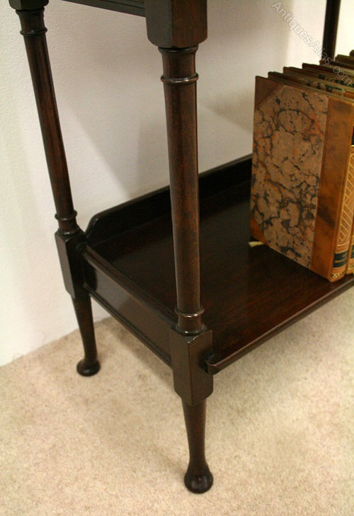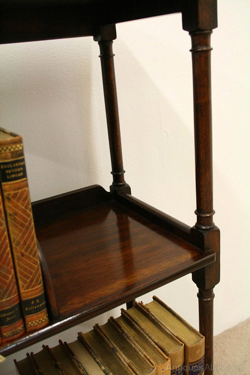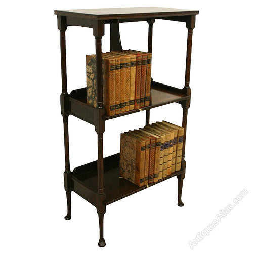 Circa 1900, neat sized mahogany open bookcase/étagère with 3 tiers and turned supports standing on pad feet.