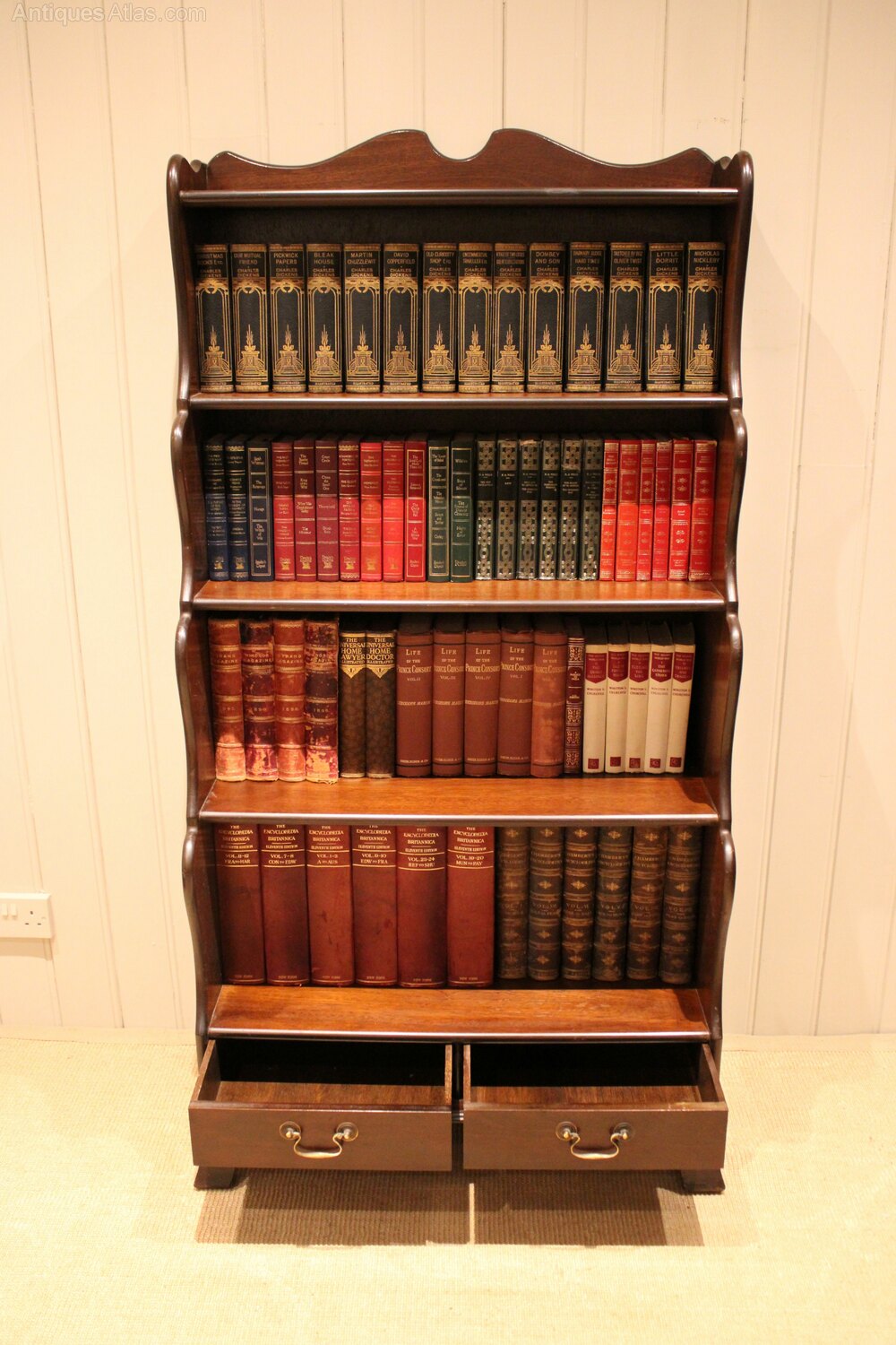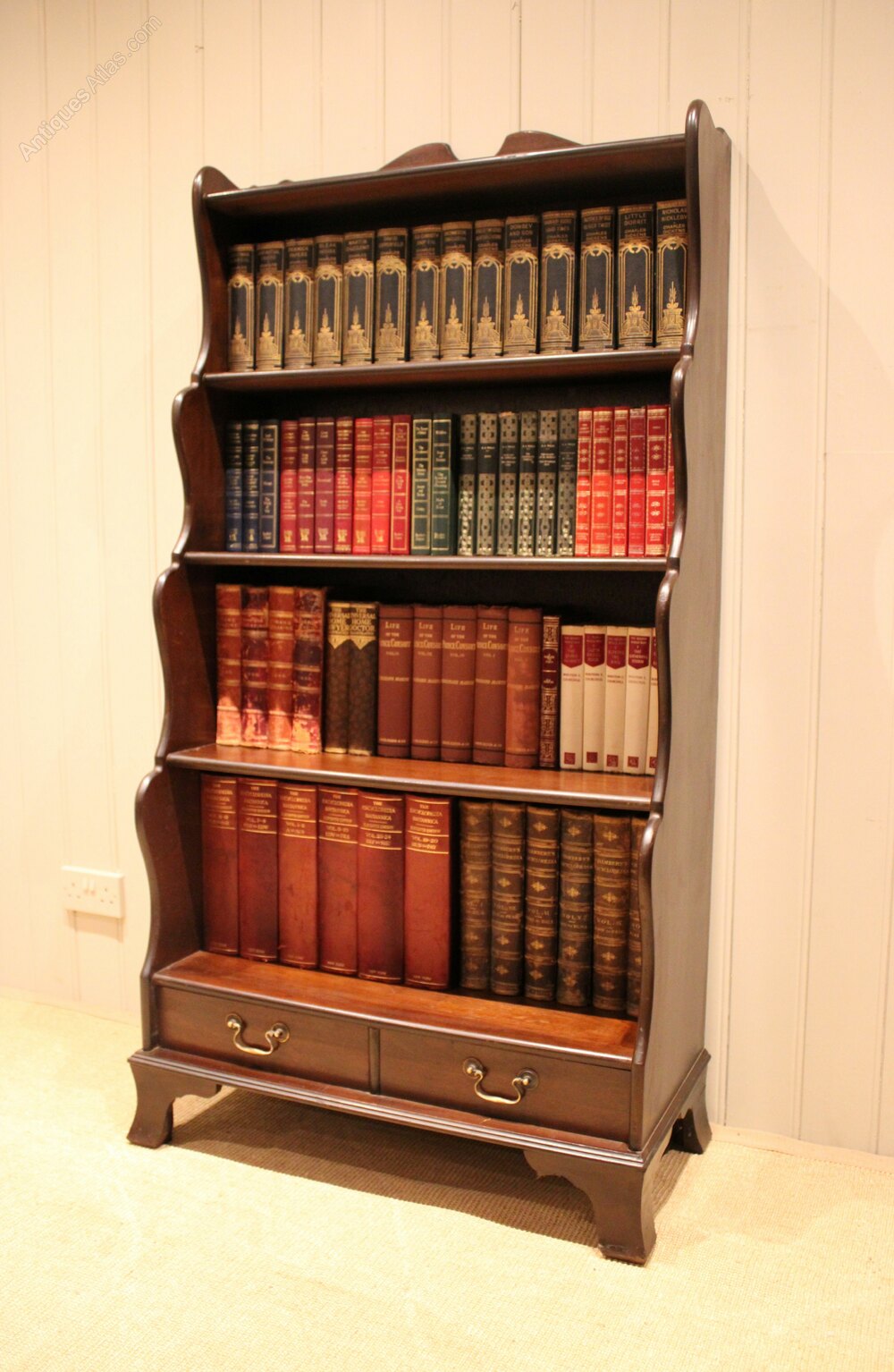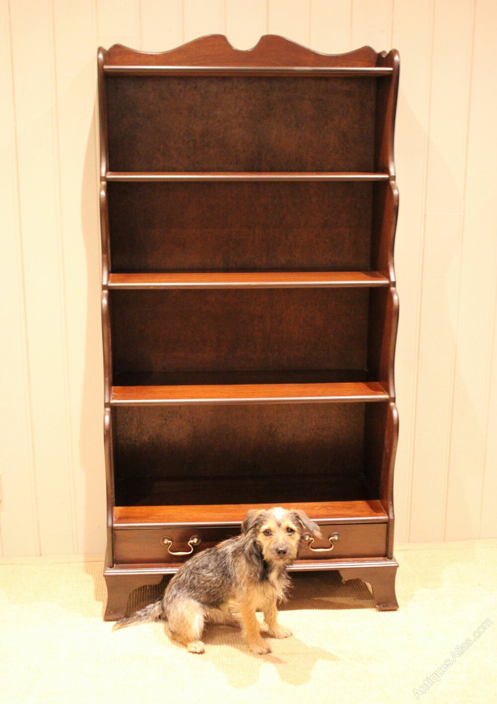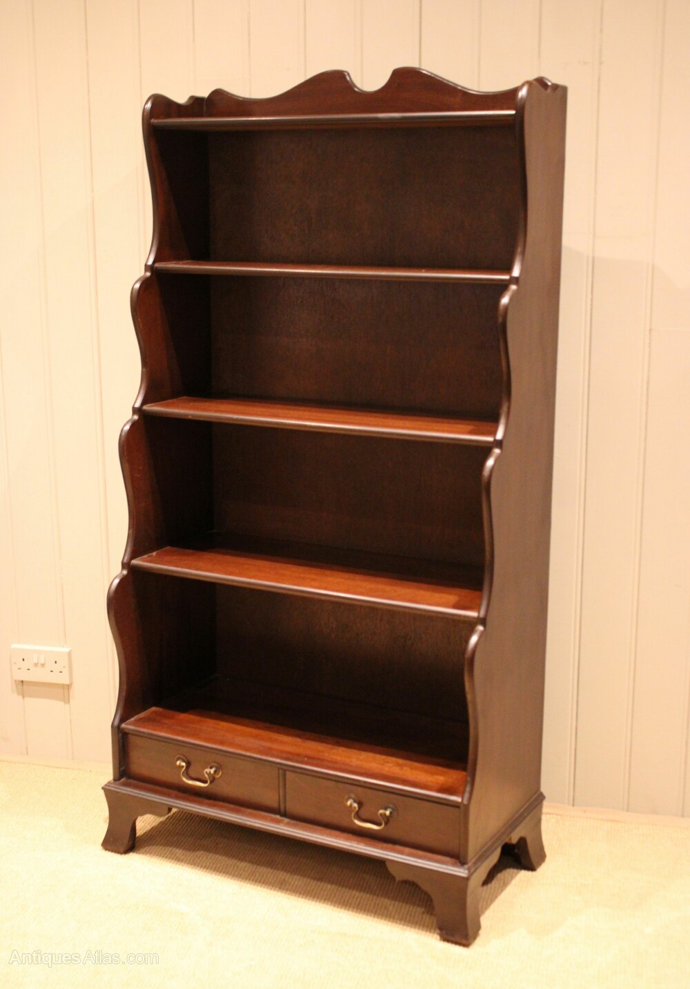 Mahogany waterfall open bookcase having a shaped top with four fixed graduated shelves with a pair of drawers to the bottom , raised on bracket feet . The shelf dimensions are 72.5 cm wide and from the bottom up 30.5 cm high x 34 cm deep , 28 cm high x 29.5 cm deep, 25 cm high x 24.5 cm deep and at the top 25 cm high x 19 cm deep