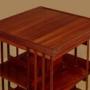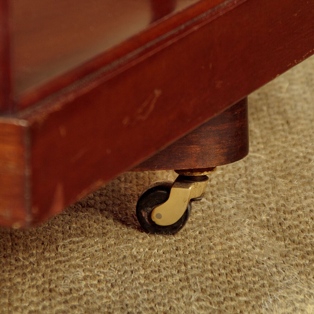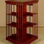 Large three tier Edwardian mahogany revolving bookcase c.1910. 24" square top with a slightly raised moulded edge to the top to prevent items from falling of the sides. Three tiers of shelves (depth 7") affording 14 feet of shelf space for books etc. Chamfered slats to the sides and a square plinth. Revolving on a crossed foot raised original black ceramic castors. Very good colour and condition, cleaned and waxed in our workshops.