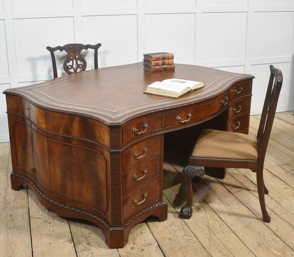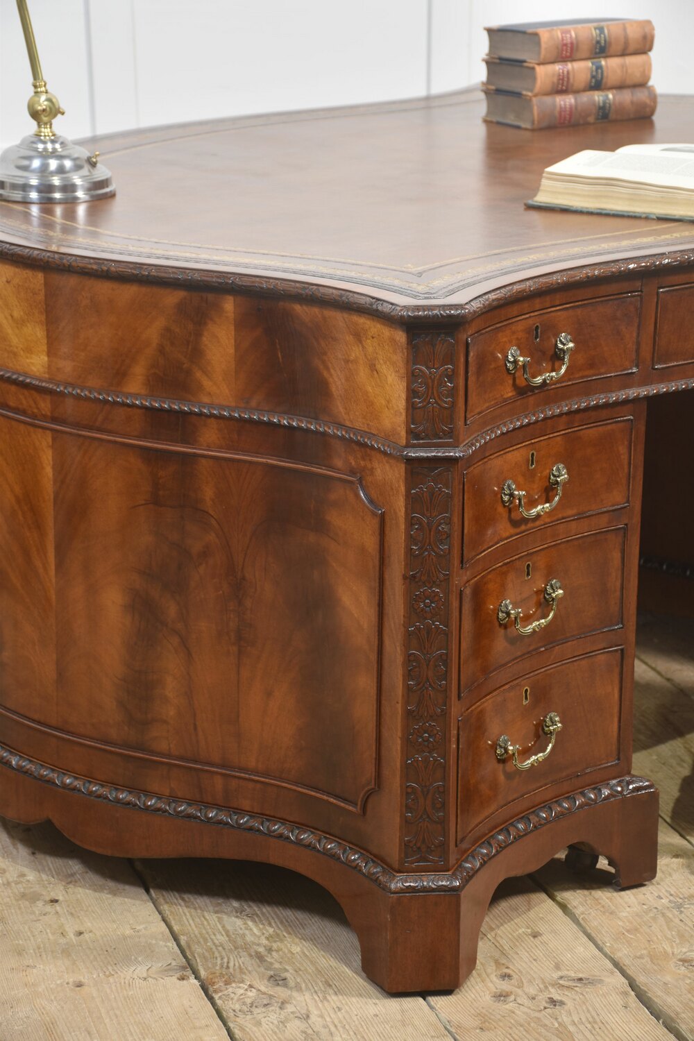 A finely crafted Chippendale Revival partner’s desk in rich mahogany, distinguished by its serpentine outline and elaborate carved ornamentation. The moulded edge encloses a gilt-tooled leather writing surface, the warm tones of which harmonise beautifully with the figured mahogany veneers.