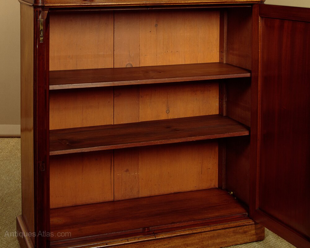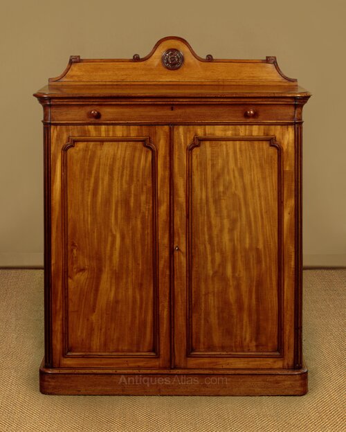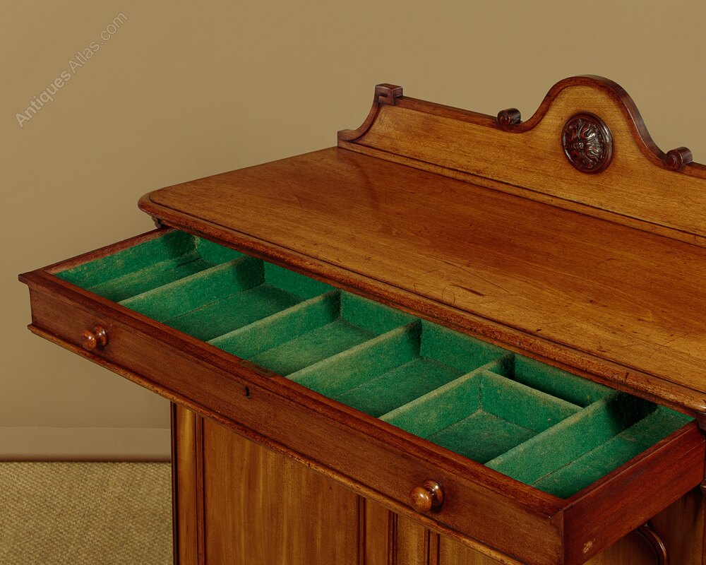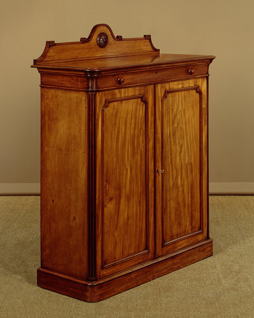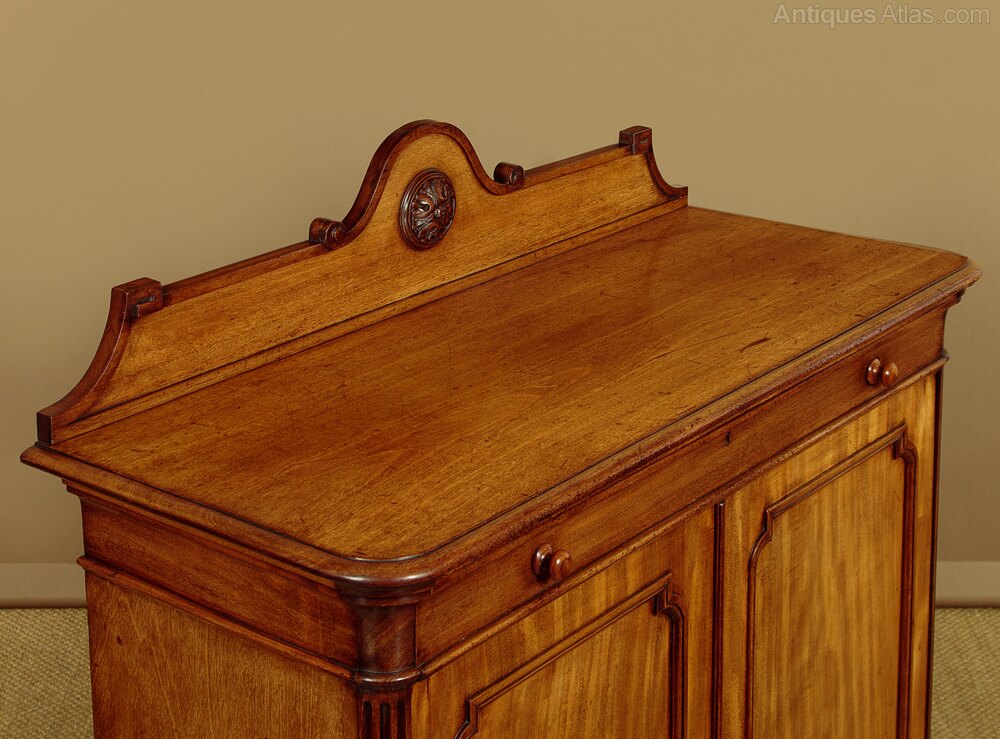 Useful mid 19th.c. mahogany chiffonier or side cabinet c.1860. Solid mahogany top with a moulded edge and featuring an attractively shaped and moulded gallery to the back edge with an acanthus carved roundel at the centre. Over a slim drawer with fitted interior of small baize line compartments and a two door cupboard with two adjustable shelves (internal depth 11½"). Matched mahogany veneers to the doors (on solid mahogany groundwork) with raised mouldings and flanked with fluted corner pilasters. Solid mahogany sides. Raised on a slim moulded plinth. Original label at the rear for the retailers Waugh & Son of Goodge Street London. Excellent colour and condition, cleaned and waxed in our workshops. Key supplied.