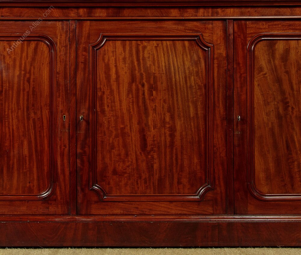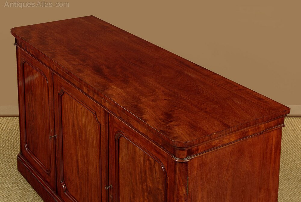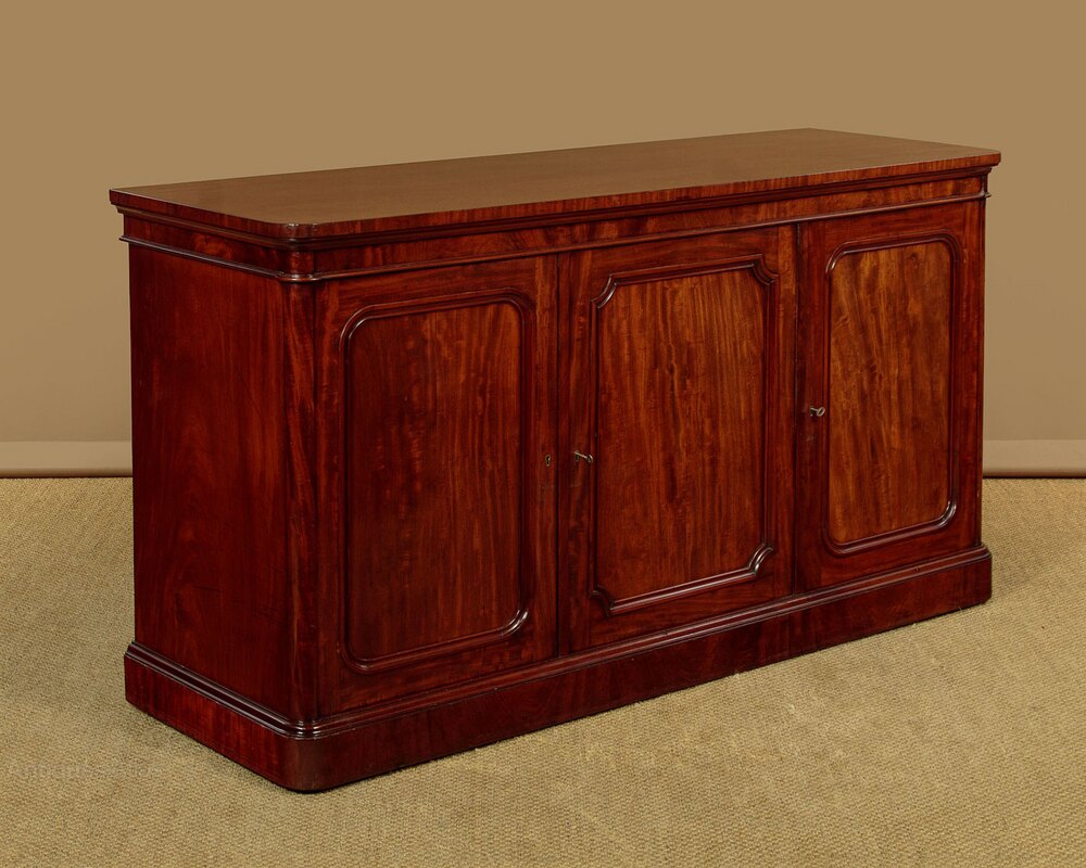 Very handsome 19th.c. English mahogany sideboard c.1870. Three cupboards (internal depth 17½") fitted inside with (from left to right) two adjustable shelves, a drawer and a single adjustable shelf, two adjustable sliding shelves. Simple uncluttered design with little applied decoration save for the crisp mouldings and the superb mahogany veneers used across the top, front and sides. Excellent colour and condition, cleaned and waxed in our workshops. Keys supplied.