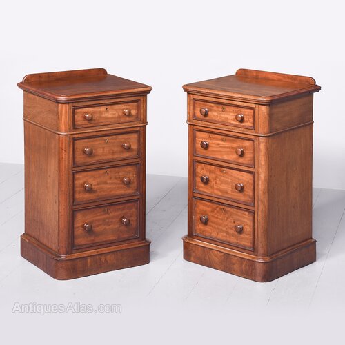 Circa 1860. Pair of exceptional quality Victorian mahogany small chest of drawers/bedside lockers. The rectangular top in a nicely figured Spanish mahogany, with moulded edges above 4 graduated drawers with mahogany drawer linings (sign of Quality) with brass locks by Hobbs and Co. London (pre-eminent lock makers). The drawers with moulded fronts and original finely turned knobs and sitting on moulded and closed plinth bases perfect condition.