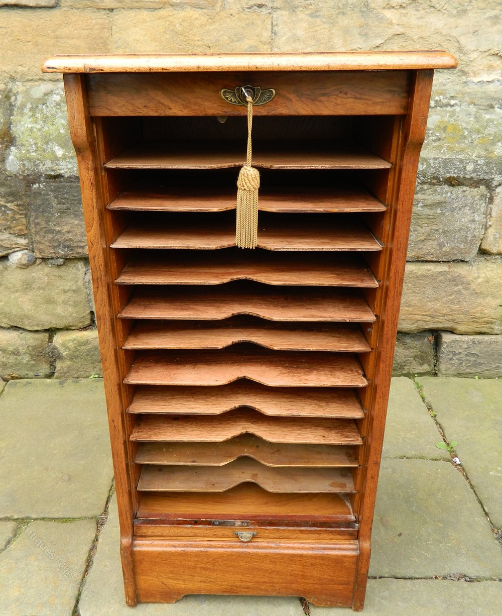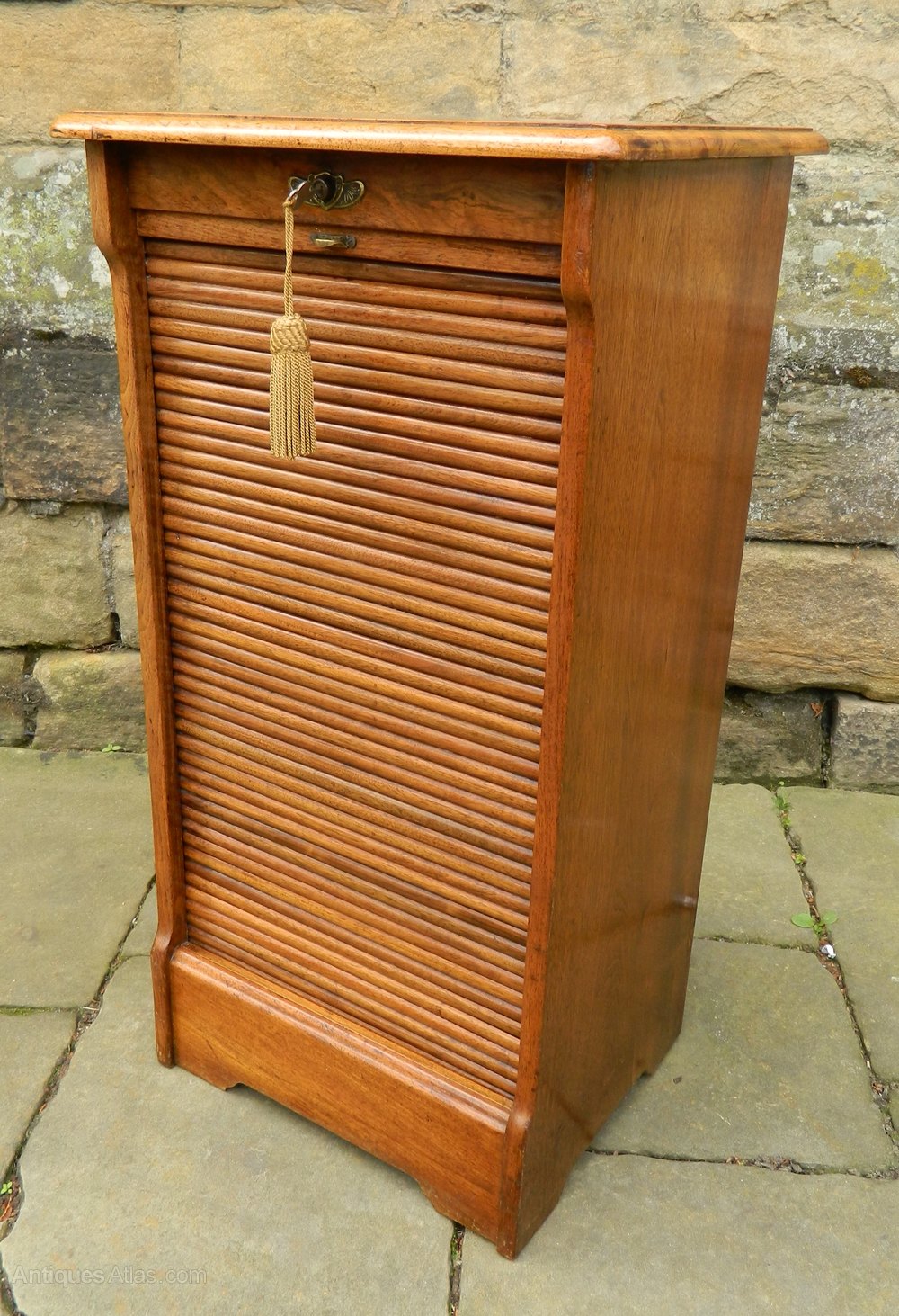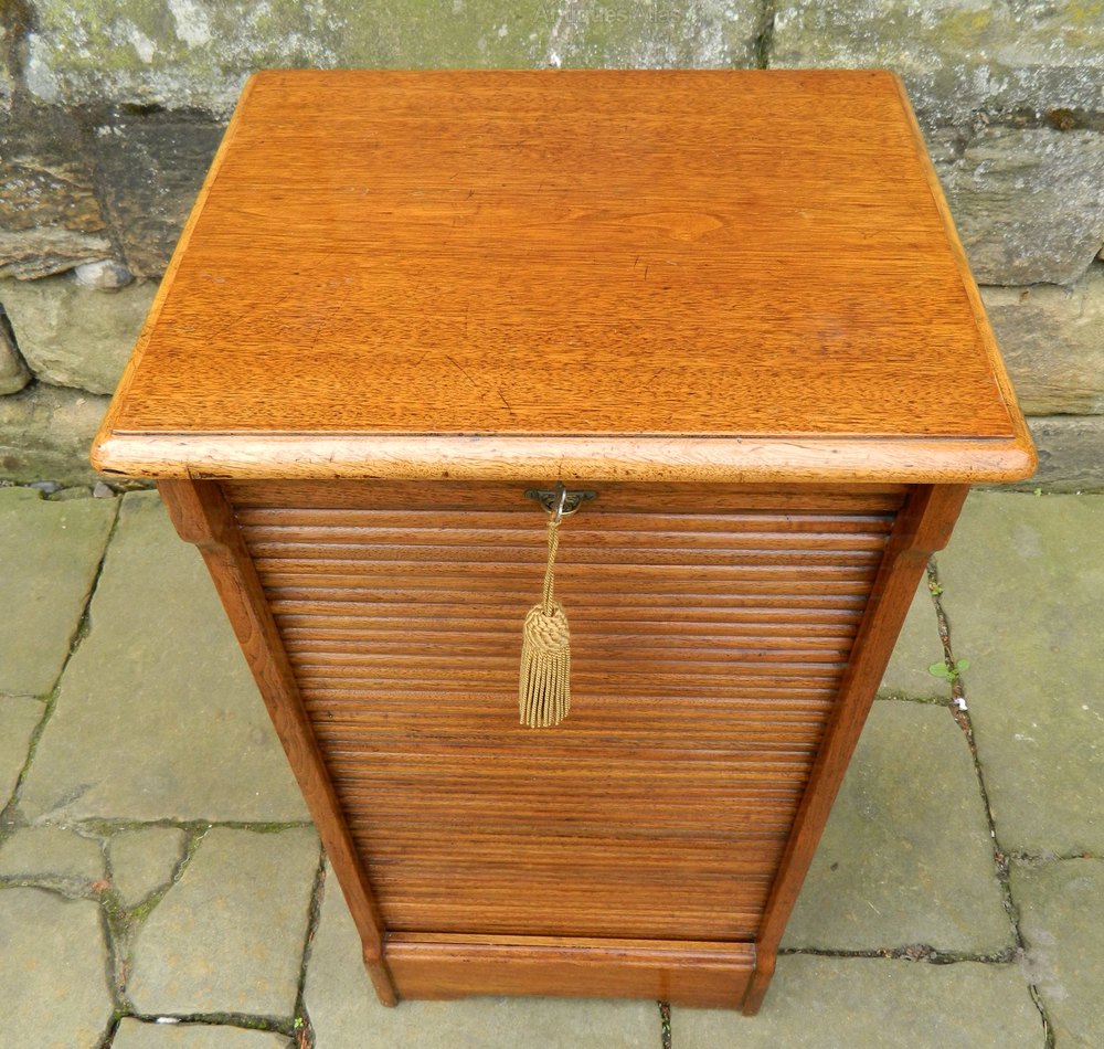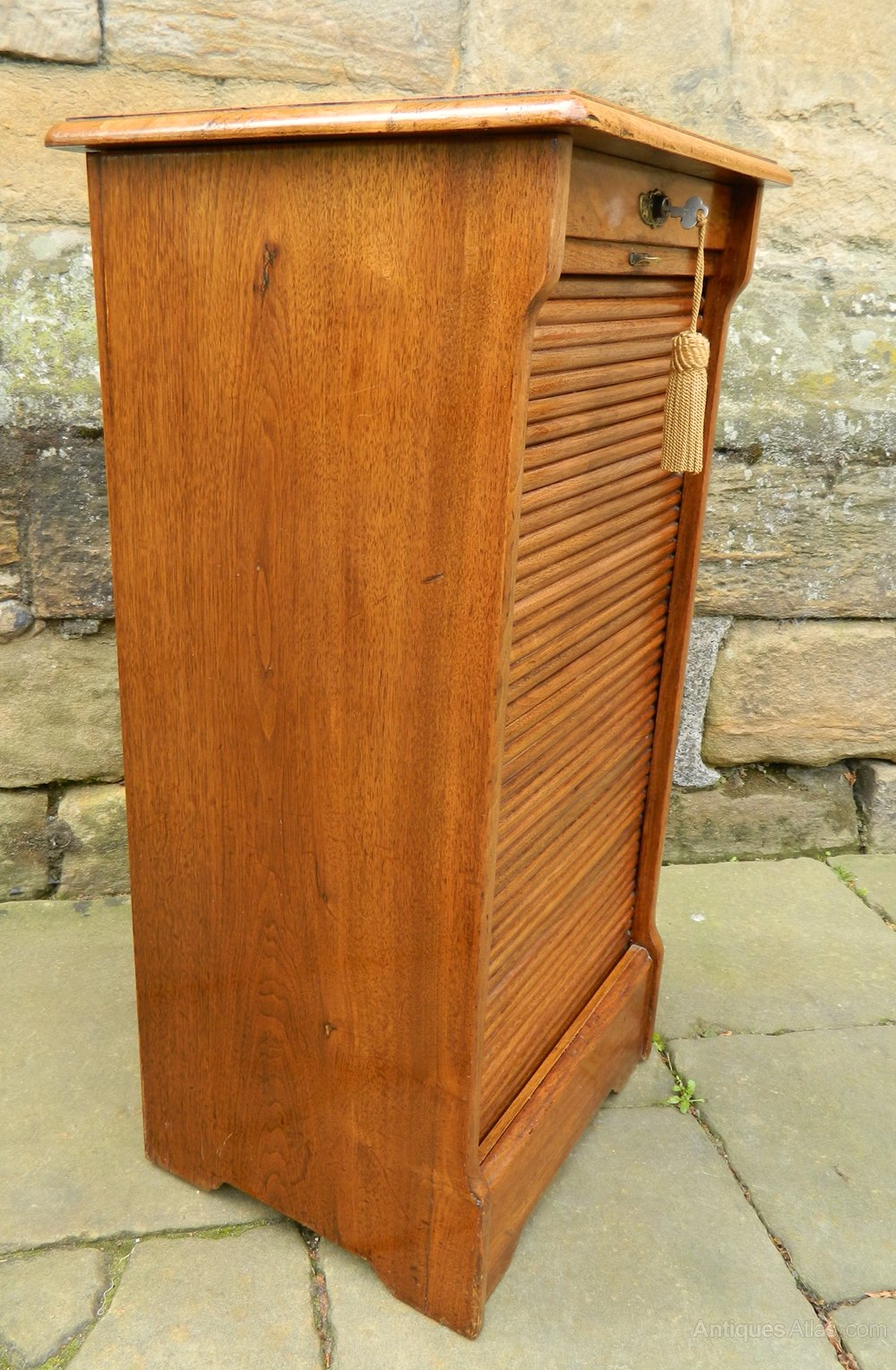 good quality mahogany tambour front filing cabinet (working lock and keys) opening to interior fitted with shelves ( not all original ), raised on plinth base.