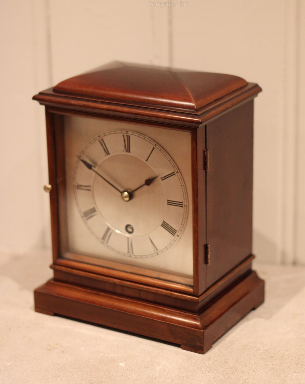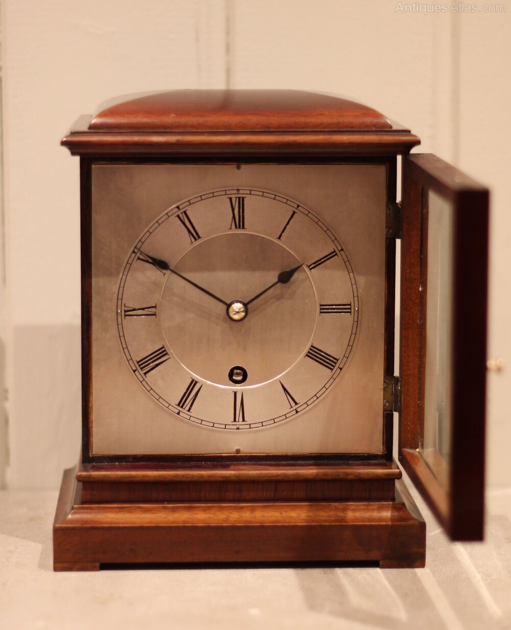 Mahogany timepiece mantel clock having a rectangular case with a stepped base and an engraved and silvered dial . The eight day movement was made by W&H Winterhalder & Hofmeier Germany