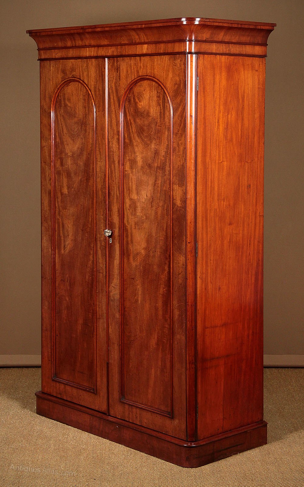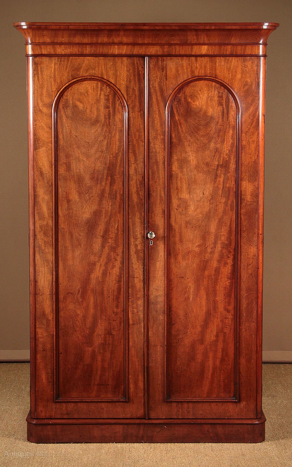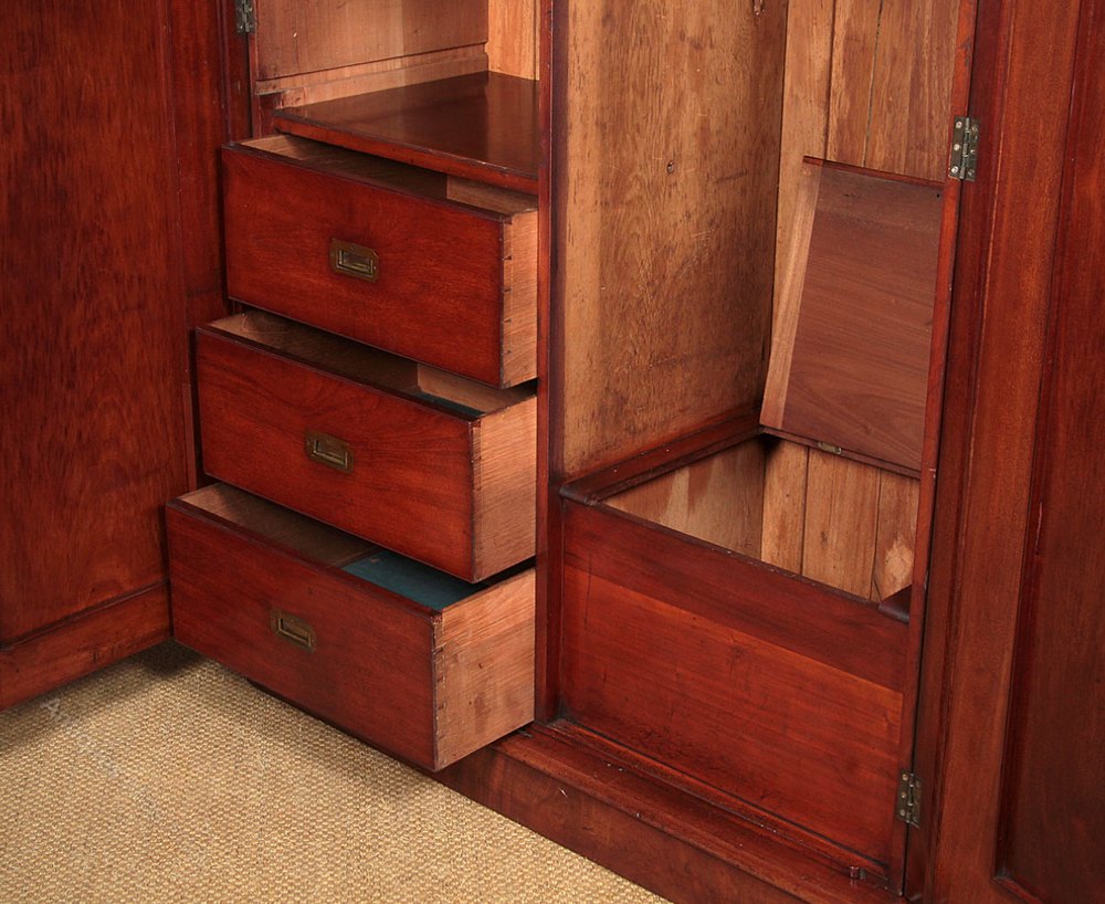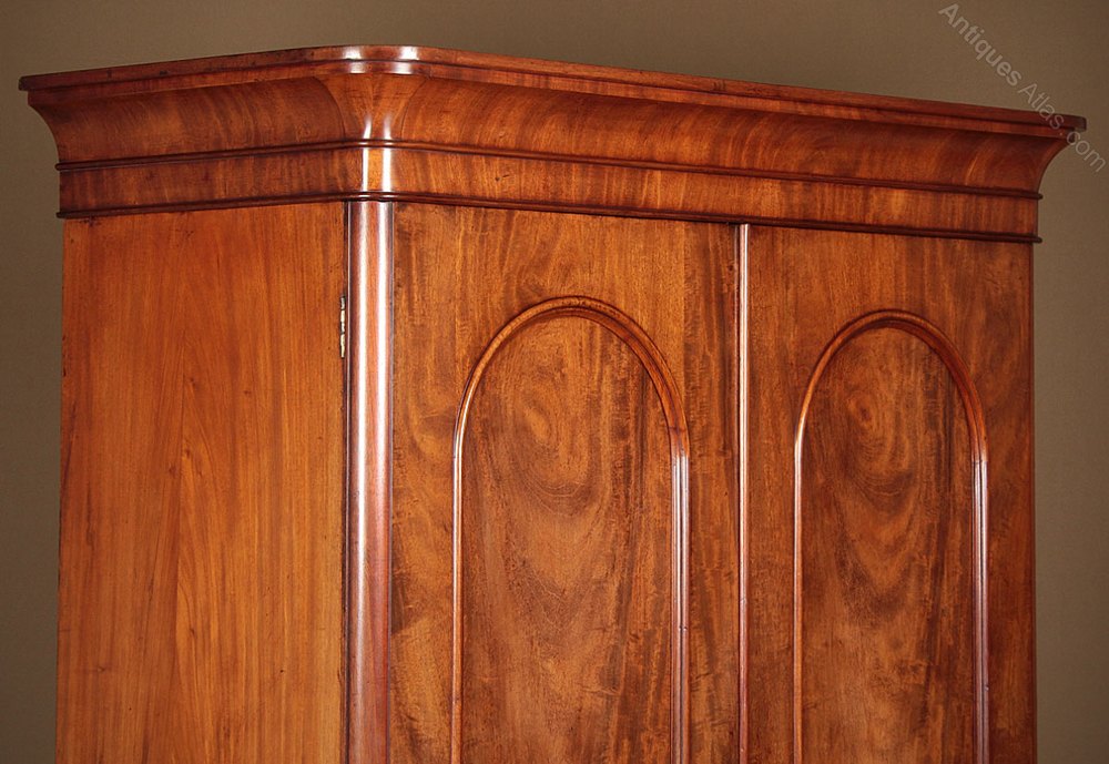 Very handsome mid 19th.c. mahogany wardrobe c.1860. Fitted with hanging rails (internal depth 18″) over three drawers to the left hand side and a small compartment with a lift up lid in the right. Simple uncluttered design with a flared and crossbanded cornice over long arch top door panels with symmetrical veneers, raised mouldings and glass knob. Hardwood lined drawers with original flush fitting brass handles. Solid mahogany groundwork to the doors and solid mahogany sides to the body of the wardrobe. Excellent colour and condition, cleaned and waxed in our workshops. Please note for delivery though the cornice is removable the body of the wardrobe is a single piece.