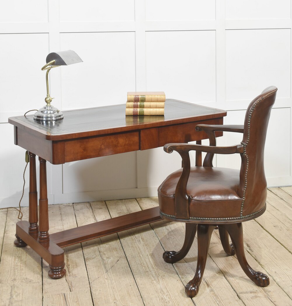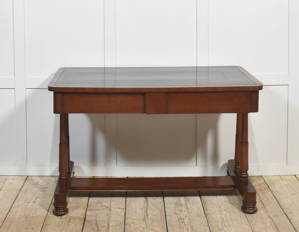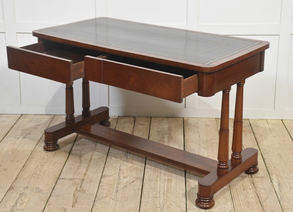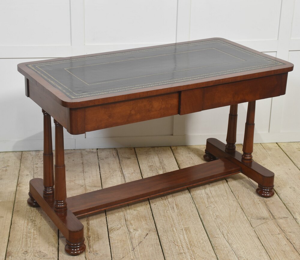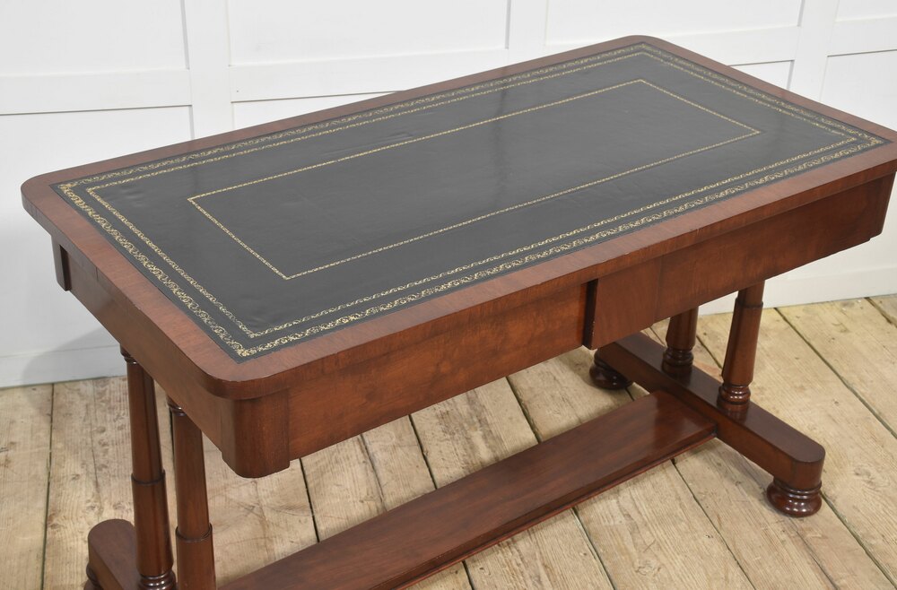 Mahogany writing table the large rectangular top with inset black tooled leather with gilt-tooled border. Above the frieze fitted with two drawers, all raised up on cylindrical supports united by stretchers, termanatting in bun feet with recessed brass castors.