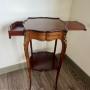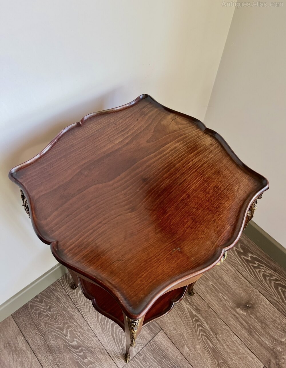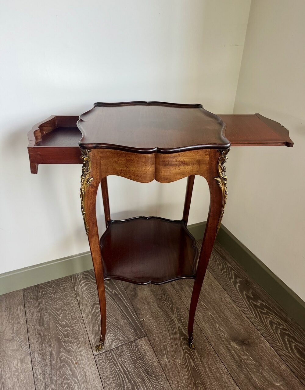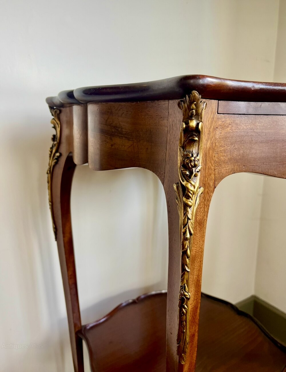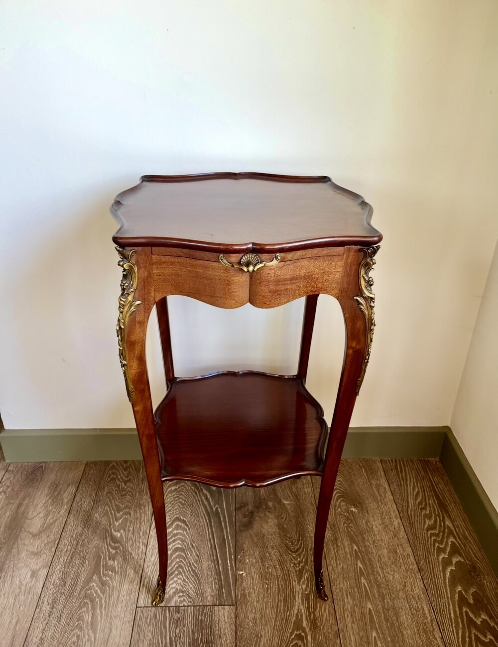 Wonderful quality mahogany two tier table in the manner of Francois Linke with dished top and under tier in the nicest grained mahogany with slide and spring loaded drawer to top section and with finely chased gilt bronze mounts in excellent original condition. Please get in touch if you need any further details.