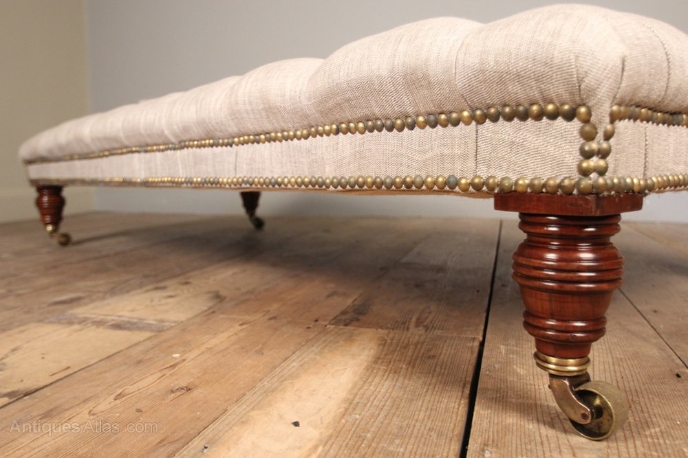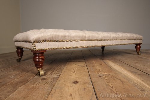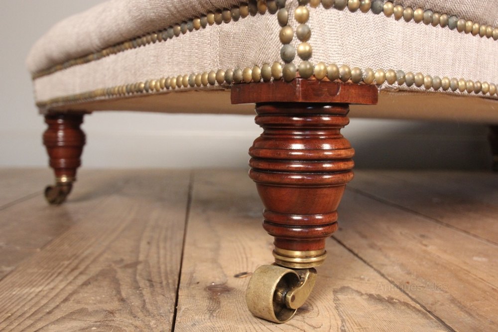 A large and well proportioned high quality 19th century centre stool. Raised on Mahogany ring turned legs with the original brass cup castors. The top deep buttoned and retaining the horse hair inners. Newly re-Upholstered in a natural linen with brass stud work decoration. This lovely centre stool is buttoned with a flat top, making it an excellent alternative to a coffee table with the addition of a tray. English, circa 1870.