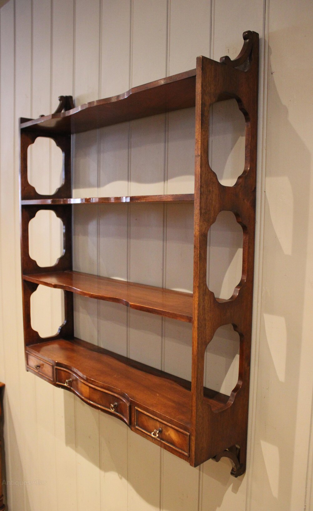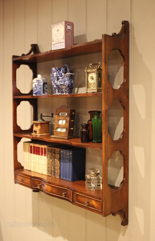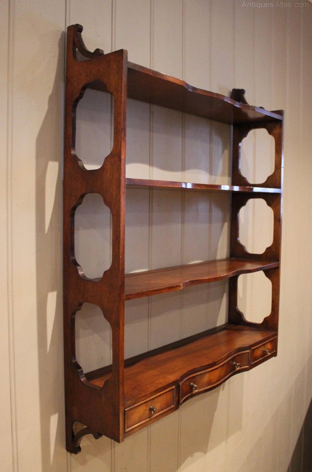 Set of mahogany wall shelves having a three drawer base below three shelves with decorative open sides and a shaped top.