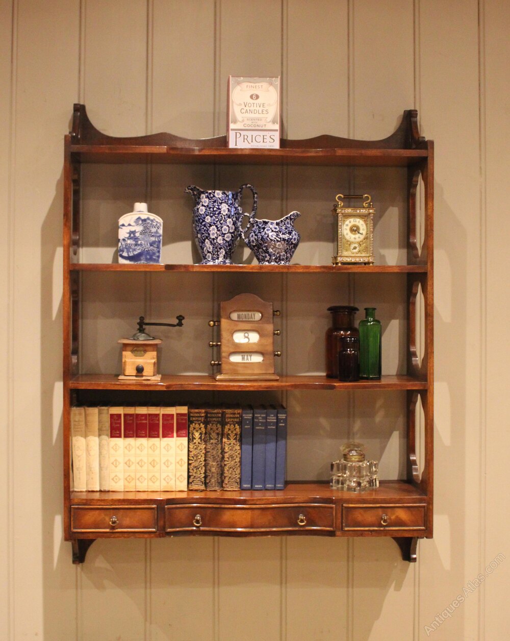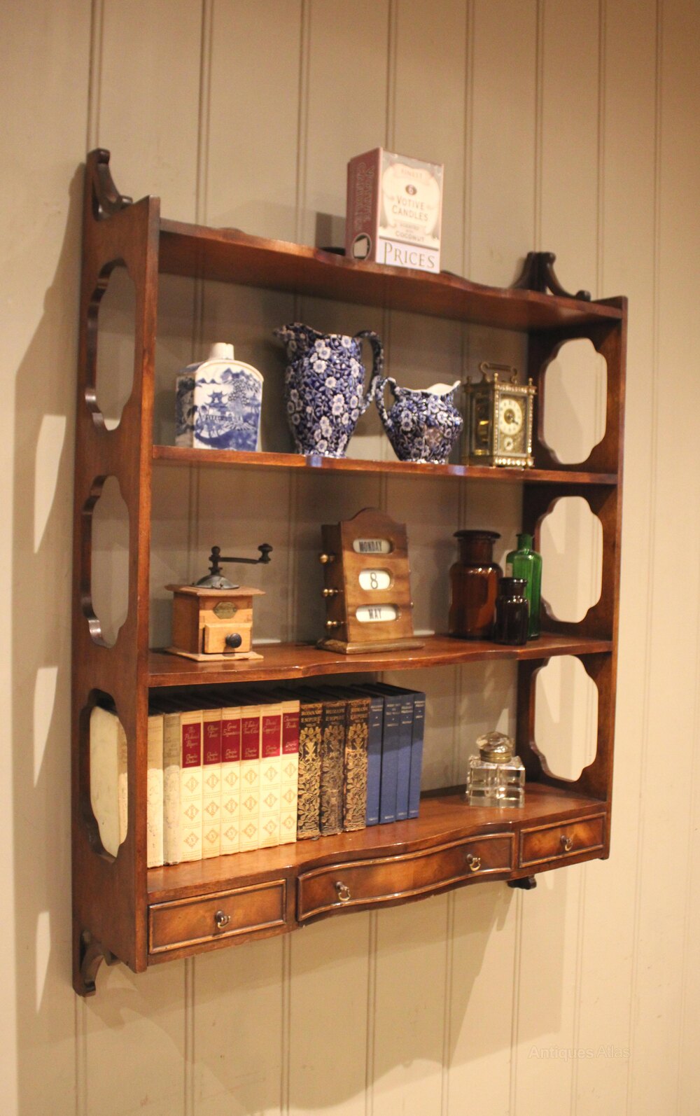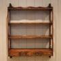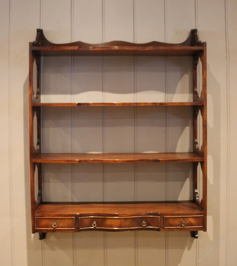 Set of mahogany wall shelves having a three drawer base below three shelves with decorative open sides and a shaped top.