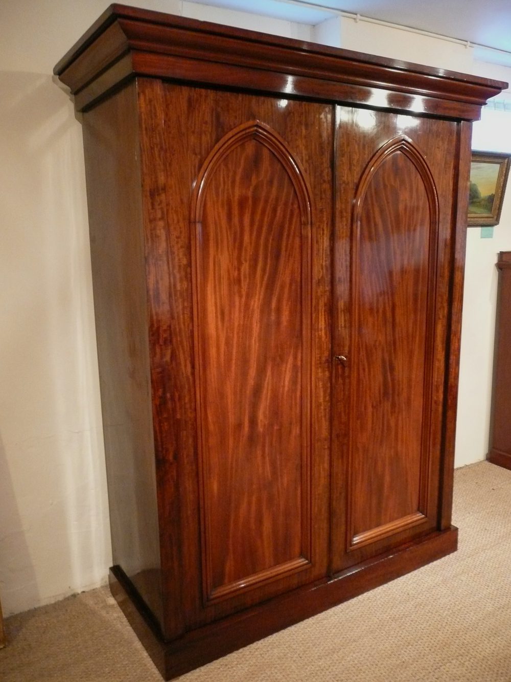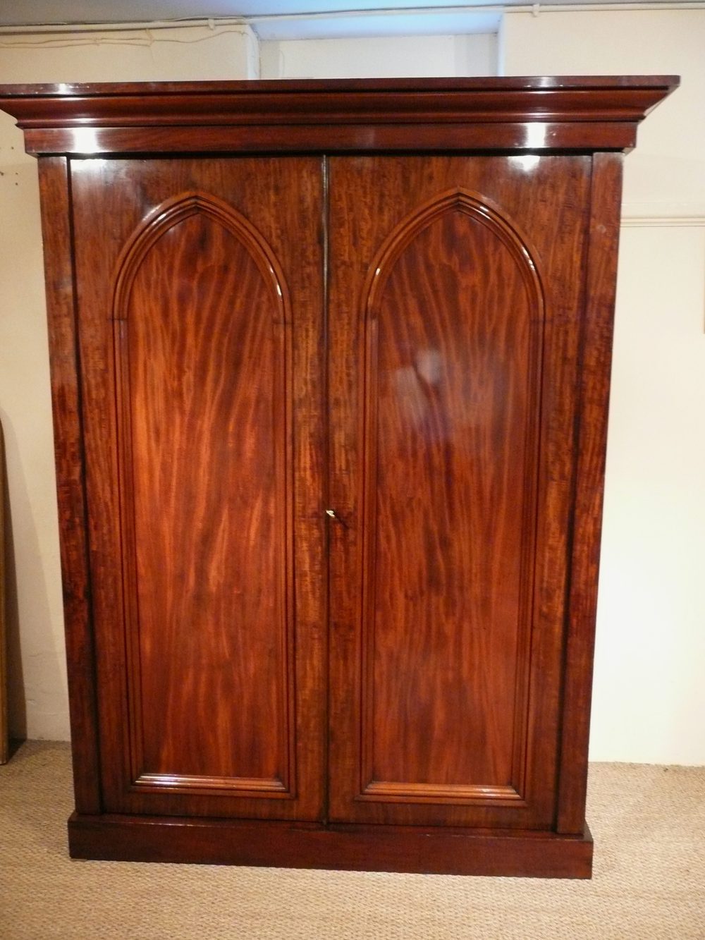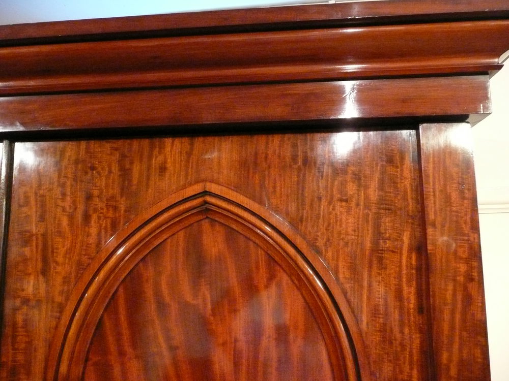 Stunning quality figured mahogany 2 part wardrobe from the 1830,s, standing on plinth base. Wonderful colour and condition. A very useful antique , this wardrobe has plenty of storage, a good deep hanging space with drawers and linen shelves. Dismantles into 4 sections. The stylish gothic doors are a rarely seen feature and the whole wardrobe retains a mellow antique patination.
