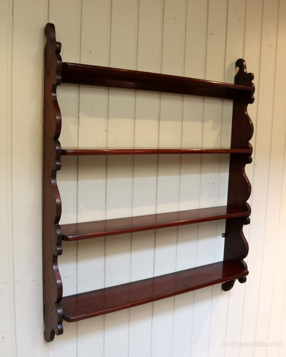 Mahogany waterfall wall shelves with shaped sides and four tiers