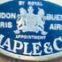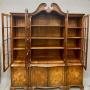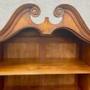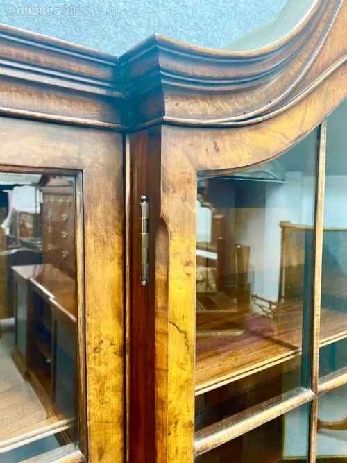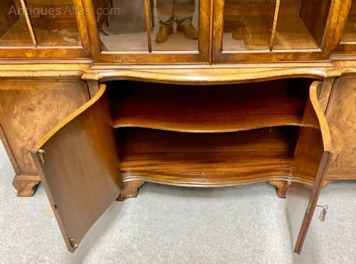 An attractive and good quality Maple & Co. walnut breakfront George Il style bookcase. The top having a swan neck pediment with cross grain mouldings above the beaded frieze. The 4 glazed doors all with solid walnut cross grain astragal bars and subtle canted corners. The doors open to an arrangement of 3 fully adjustable walnut shelves. The breakfront base having a serpentine shaped centre with 4 cross banded doors and the whole standing on a cross grain moulded base with ogee shaped bracket feet with acanthus carved detail. This bookcase retains the maker’s label for “ MAPLE & CO. BY ROYAL APPOINTMENT. LONDON, PARIS & BUENOS ARIES “. Fully cleaned and waxed with all working locks and keys. Dimensions:- Height…86’’/ 218.5cm. Width…73’’/ 185.5cm. Base Depth…19’’/ 48.5cm. Top Depth…17’’/ 43cm. Delivery to most of U.K. mainland £120.