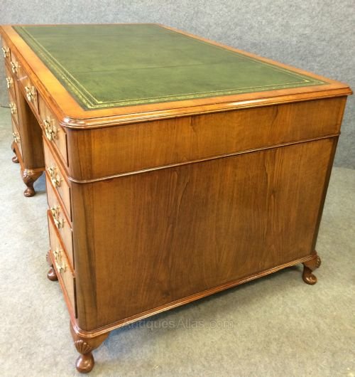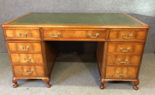 A good freestanding figured walnut desk by Maples of London. Of round cornered design with short cabriole legs and shell carved knees. The 9 graduated drawers all with book matched figured walnut veneered fronts and cock beading with good cast brass swan neck handles with pierced oval back plates. The cross banded top with moulded edge and inset hand dyed green leather writing surface with blind and gold tooling. The whole in excellent condition and ready for use. Sizes- Width..60''/153cm. Depth...36''/92cm. Height...30.5''/77.5cm. Kneehole Height...24.5''/ 62cm. Transports in 3 pieces. Delivery to most of U.K. mainland £85.