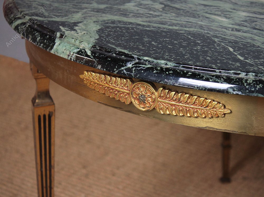 Good sized mid 20th.c. brass and marble coffee table c.1950. Well figured, inch-thick green marble top of 31″ diameter, with a thumb moulded edge. Brass base with Regency pattern mounts and tapering square legs with fluted detail. Excellent condition.