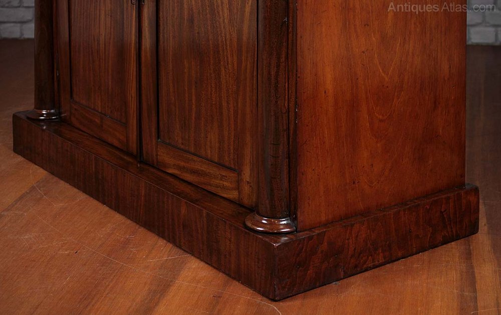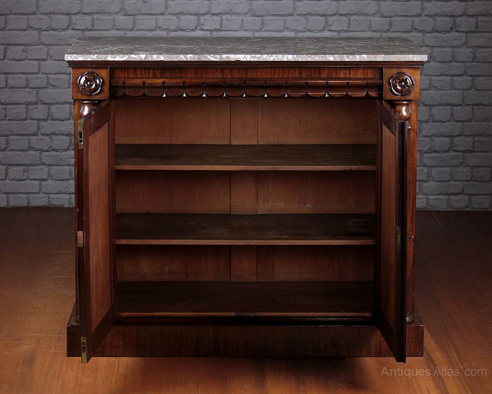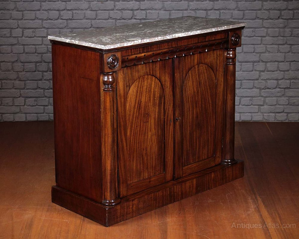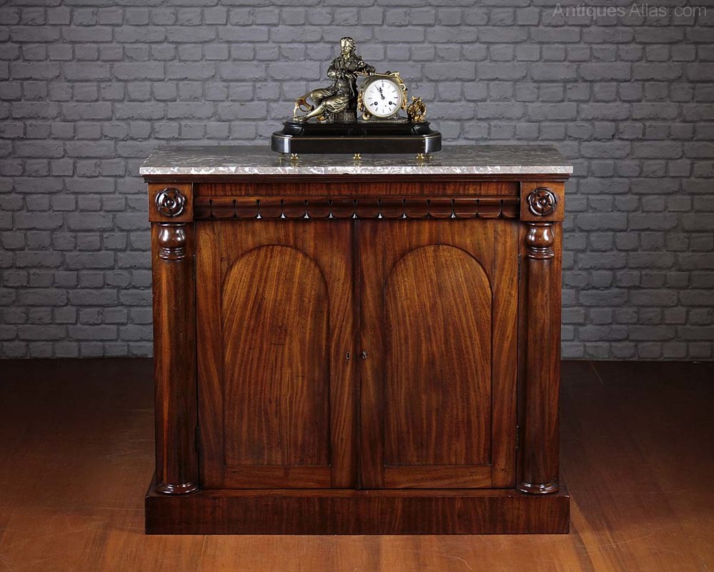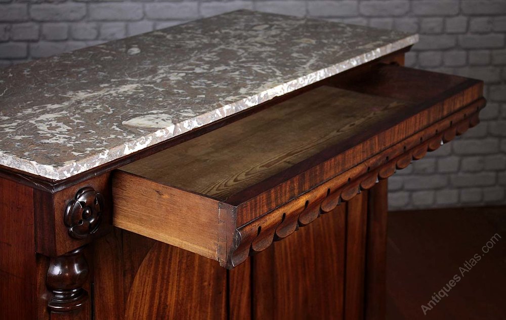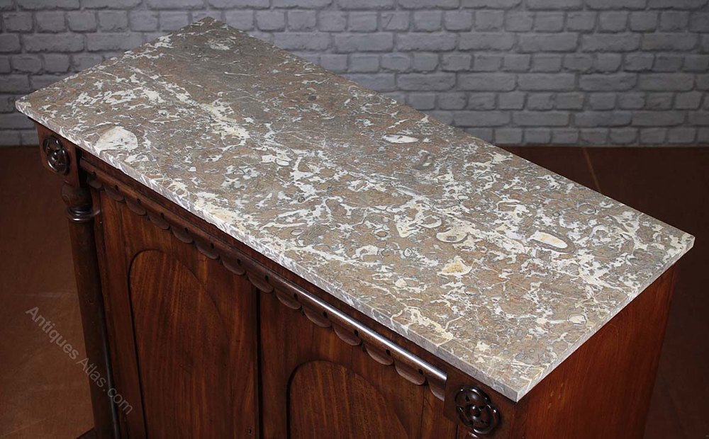 Mid 19th.c. marble top mahogany chiffonier side cabinet c.1860. Period figured grey marble top over a single long drawer and two door cupboard fitted with two shelves. Unusually decorative design with a shaped frieze across the drawer front, carved roundels, arched door panels and faux columns. Solid mahogany sides and drawer sides. Excellent colour and condition, cleaned and polished in our workshops.
