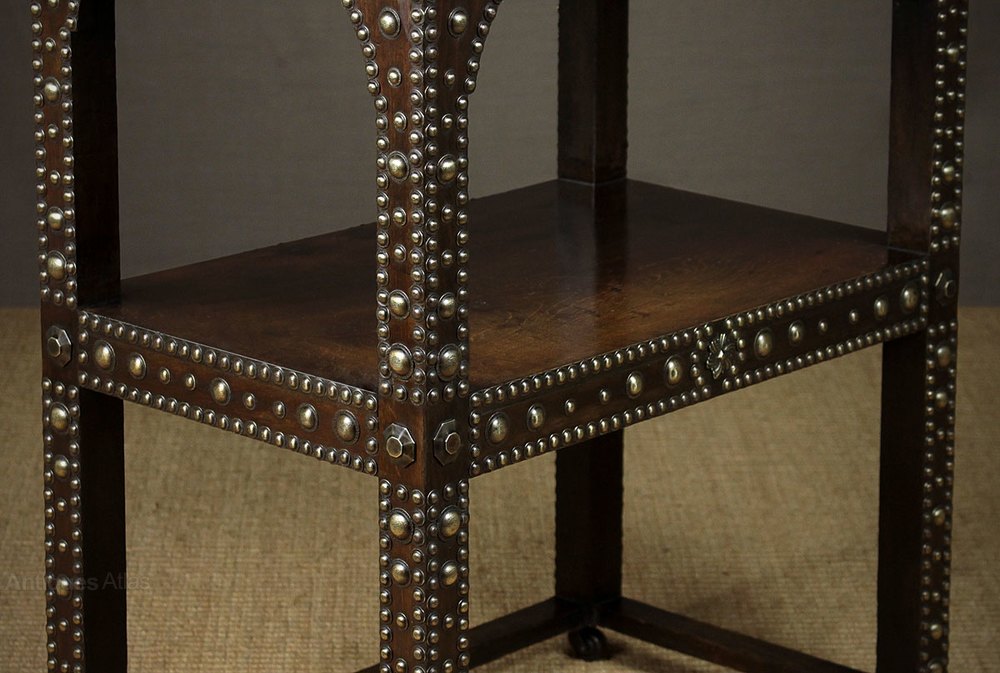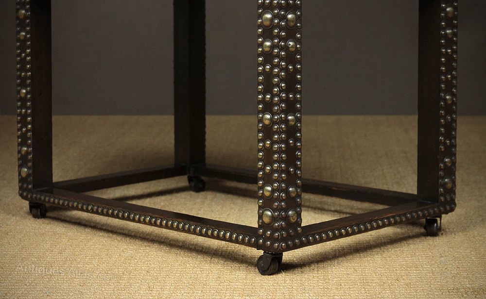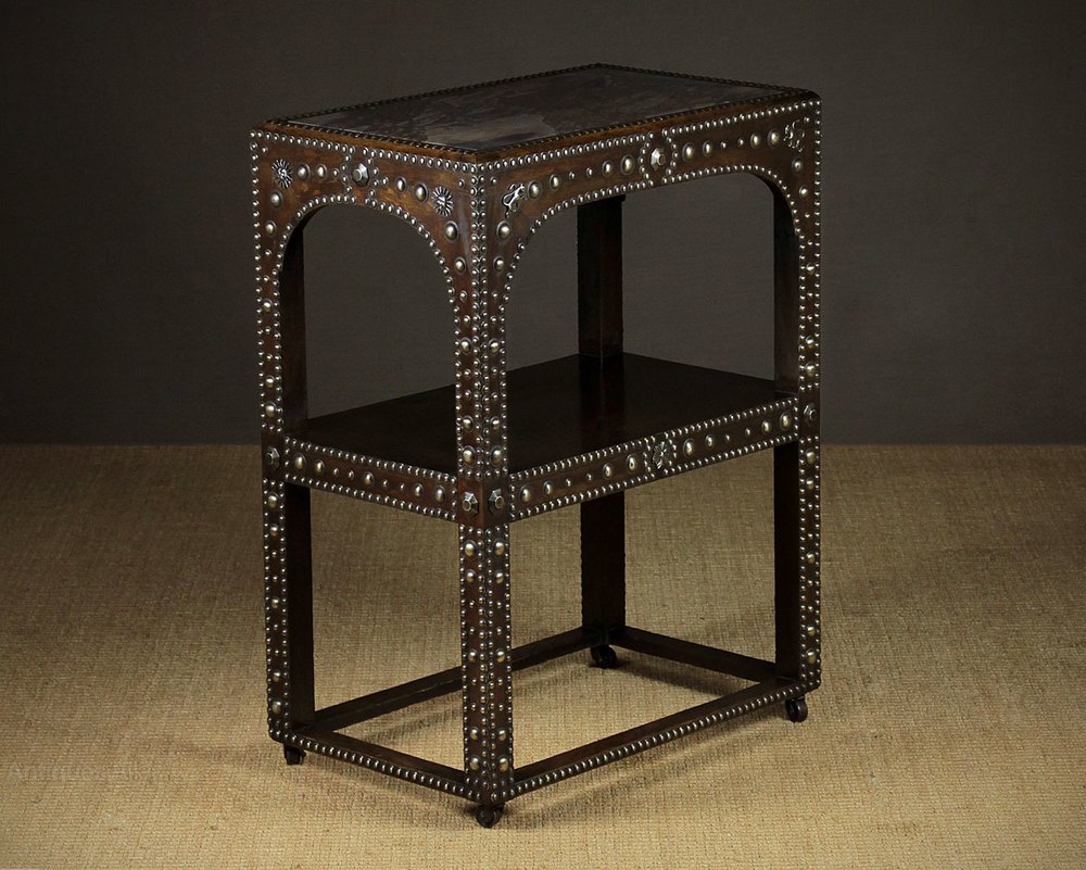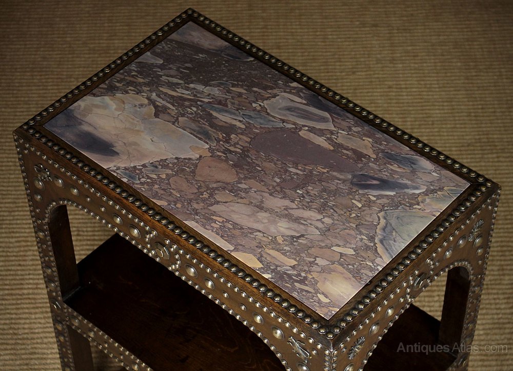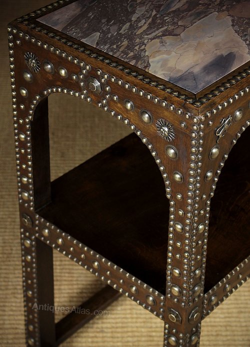 Very unuusal two tier Medieval revival marble top oak side table c.1910. Beautifully figured marble top on a two tier oak frame heavily studded with decorative brasswork on all four sides. Raised on castors. Excellent condition, cleaned and polished in our workshops.