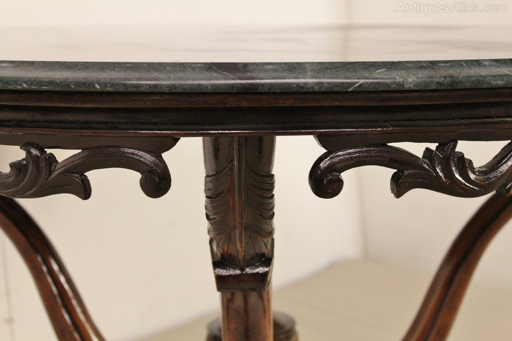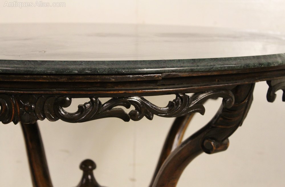 A stylish 19th century marble topped center table. The "basket" base is made from solid walnut in scrolling form and with carved floral decorations. It has a lovely colour and patina. The round blue/green solid marble top is stunning. It has an open fretwork freeze beneath. This beautiful table would work well in a number of rooms of the modern home, eg, hall, living room, lounge etc. It is offered for sale in excellent original condition, ready to go straight into the home.