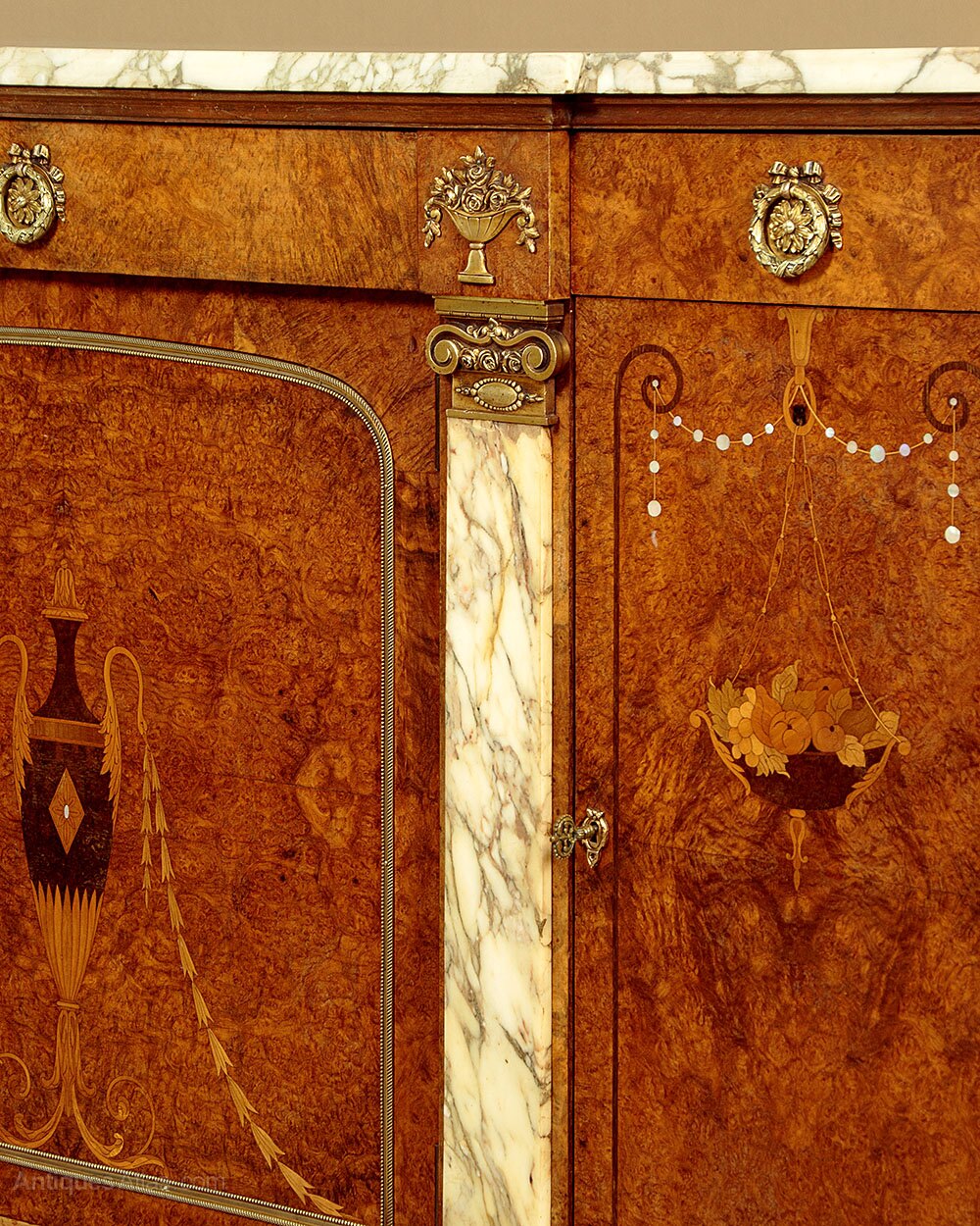 Impressive marble top sideboard attributed to the the Paris maker Georges Guerin c.1910. White marble top with grey figuring, breakfronted and with rounded ends. Over three drawers and a large central cupboard fitted with a single shelf inside (internal depth 16"), flanked with smaller cupboards to each side. Highly figured burr elm veneers laid in striking symmetrical pattern across the front and sides. With unusual neo-Classical decoration to the front featuring marble column pilasters with gilded mounts top and bottom. Marquetry inlaid vase detail to centre door, the side doors featuring hanging fruit bowls and mother of pearl garlands. Original gilded handles, floral mounts and mouldings. Excellent colour and condition, cleaned and waxed in our workshops. Keys supplied.