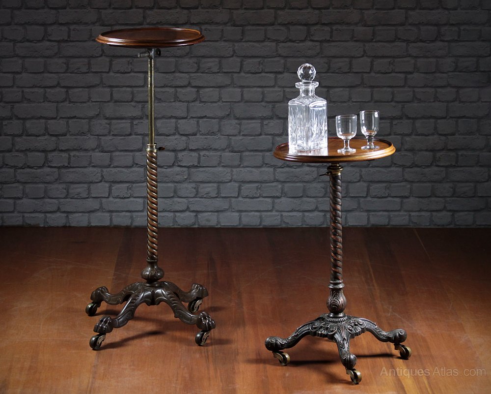 Matched pair of quality late 19th.c. occasional antique tables, c.1890. Circular solid mahogany tops with raised lips and moulded edges on height adjustable stands, with steel column and base with brass castors. Heavy cast iron bases means they remain stable even when fully extended. Excellent condition, tops have been cleaned and waxed in our workshops.