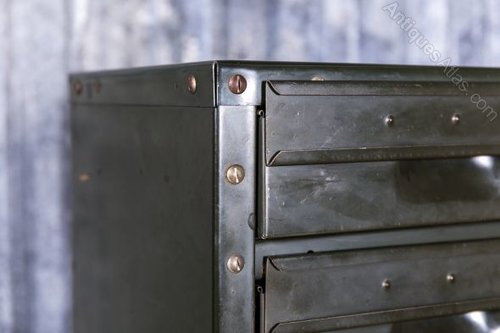 The metal unit has a dark green colouring, which adds to its industrial appearance. There are 27 drawers in this fantastic piece of antique furniture, each offering a useful place to store papers in an office, tools in a workshop, or art supplies in a studio.