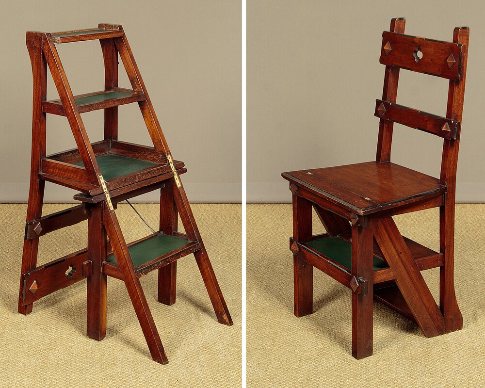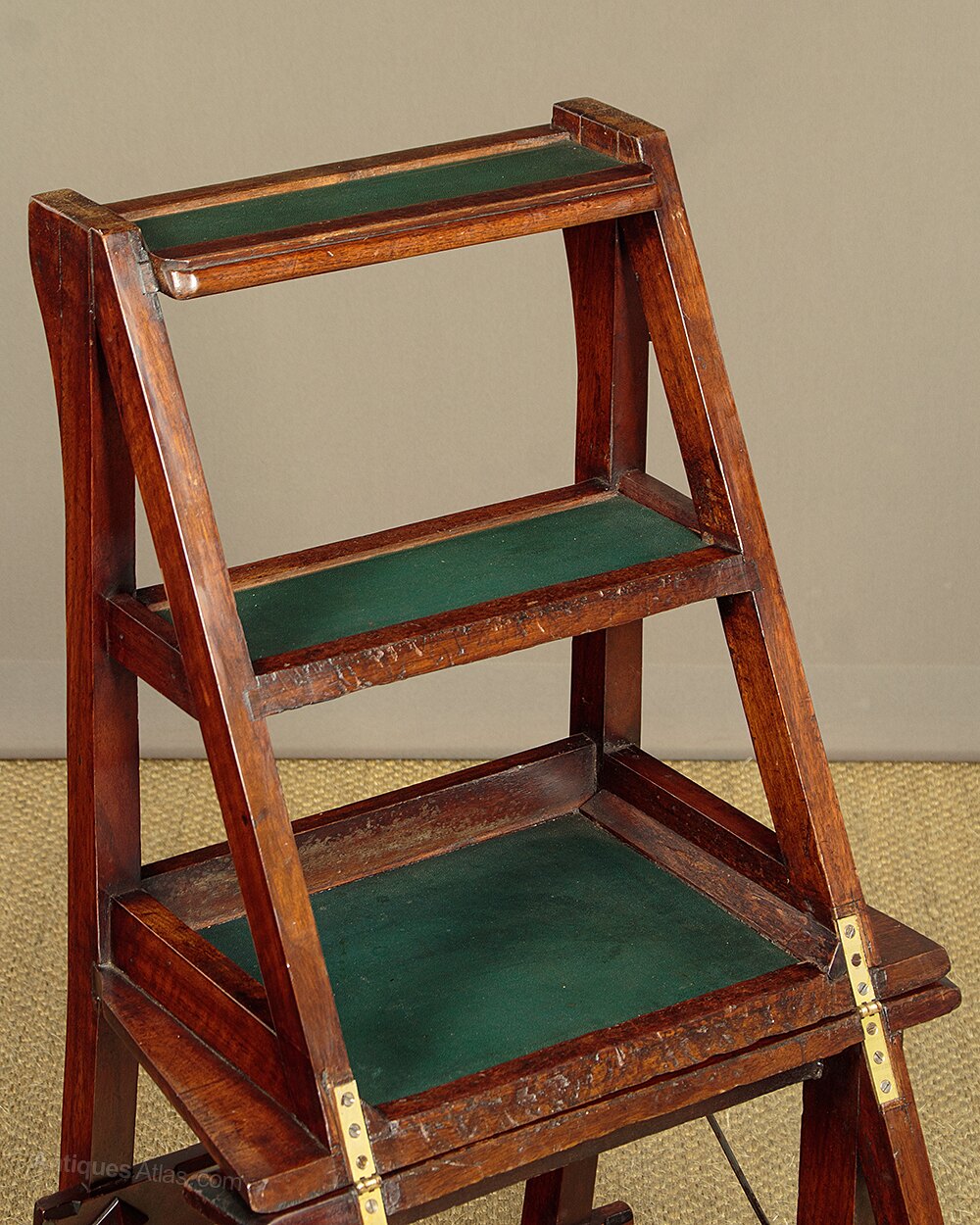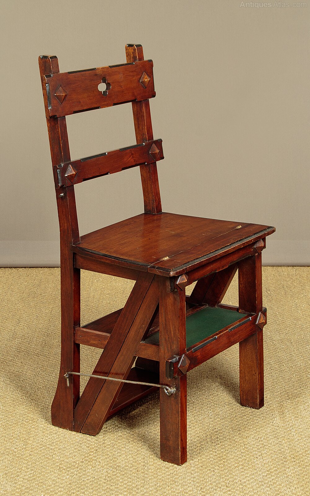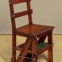 Late 19th.c. metamorphic library steps and side chair in walnut c.1870. Gothic style decoration to the backrest with a quatrefoil piercing, raised diamond mouldings and chamfered and ebonised edges continued on the seat and front legs. Backrest and seat fold over to make a useful set of library steps with the top step at 34″ from the floor. Brass hinges and steel locking stay. Very good colour and condition, restored cleaned and waxed in our workshops.