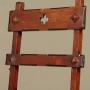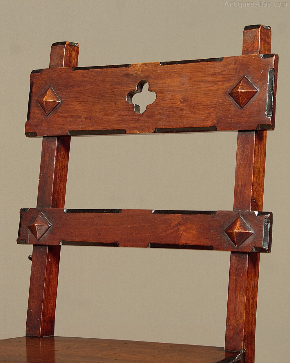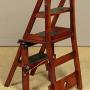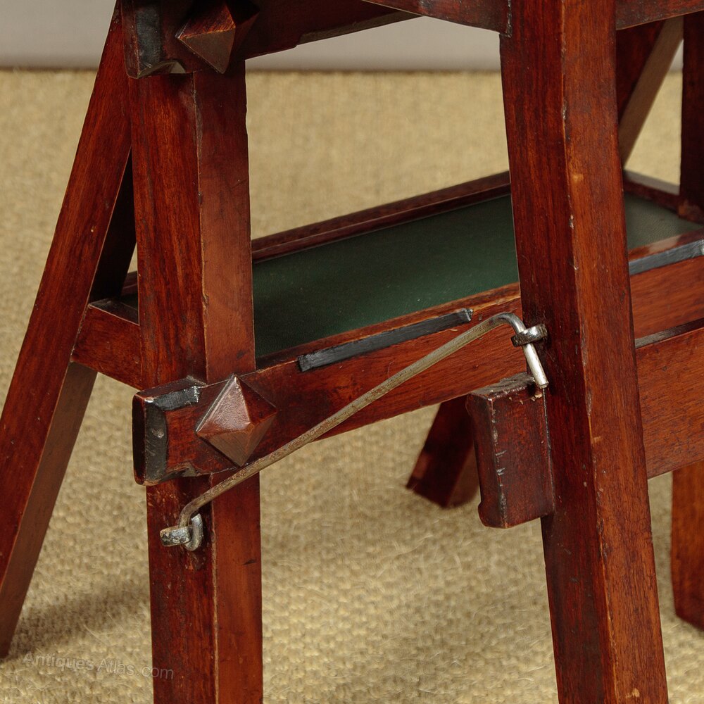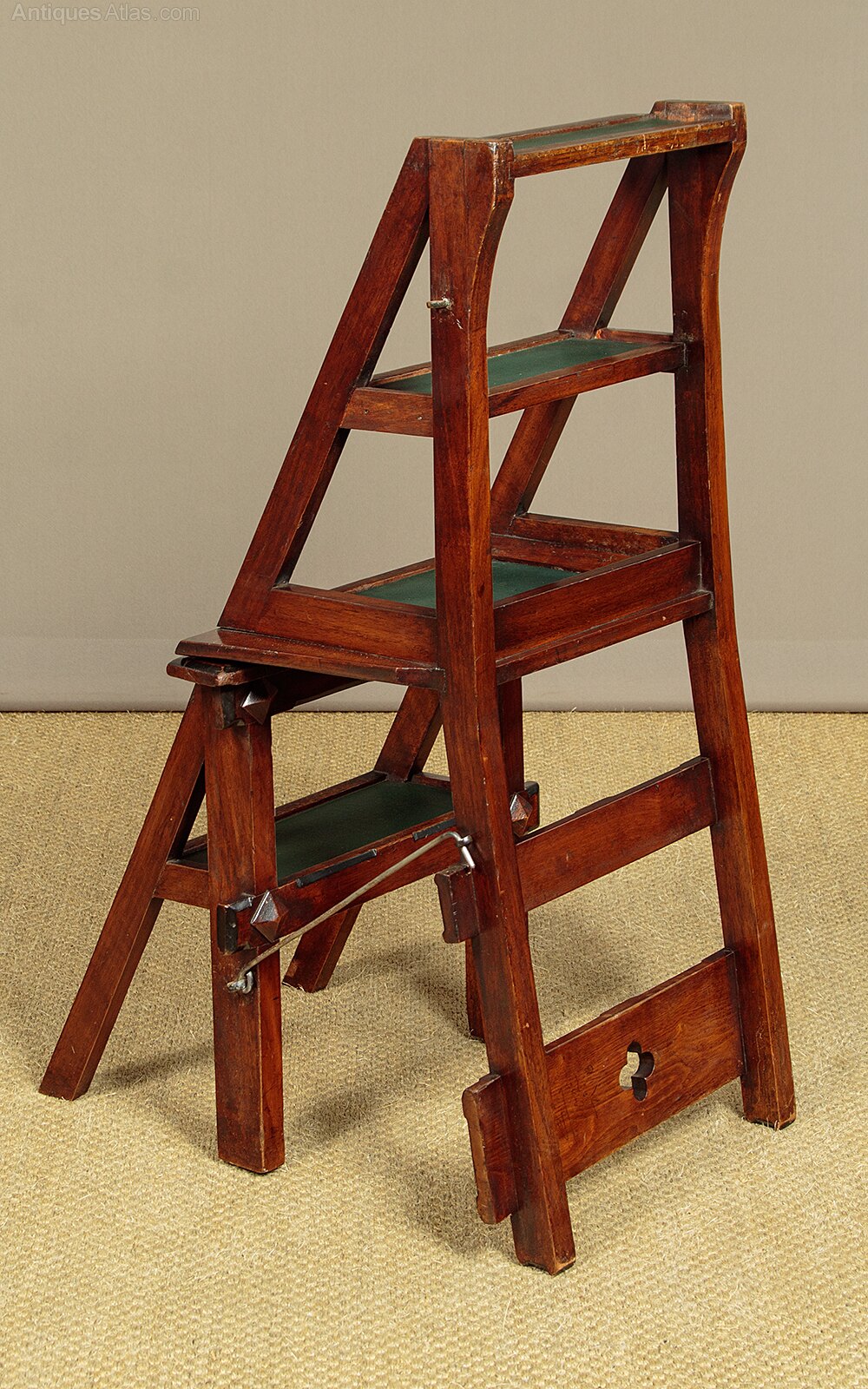 Late 19th.c. metamorphic library steps and side chair in walnut c.1870. Gothic style decoration to the backrest with a quatrefoil piercing, raised diamond mouldings and chamfered and ebonised edges continued on the seat and front legs. Backrest and seat fold over to make a useful set of library steps with the top step at 34″ from the floor. Brass hinges and steel locking stay. Very good colour and condition, restored cleaned and waxed in our workshops.