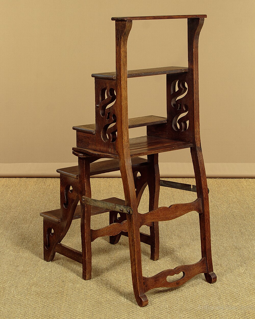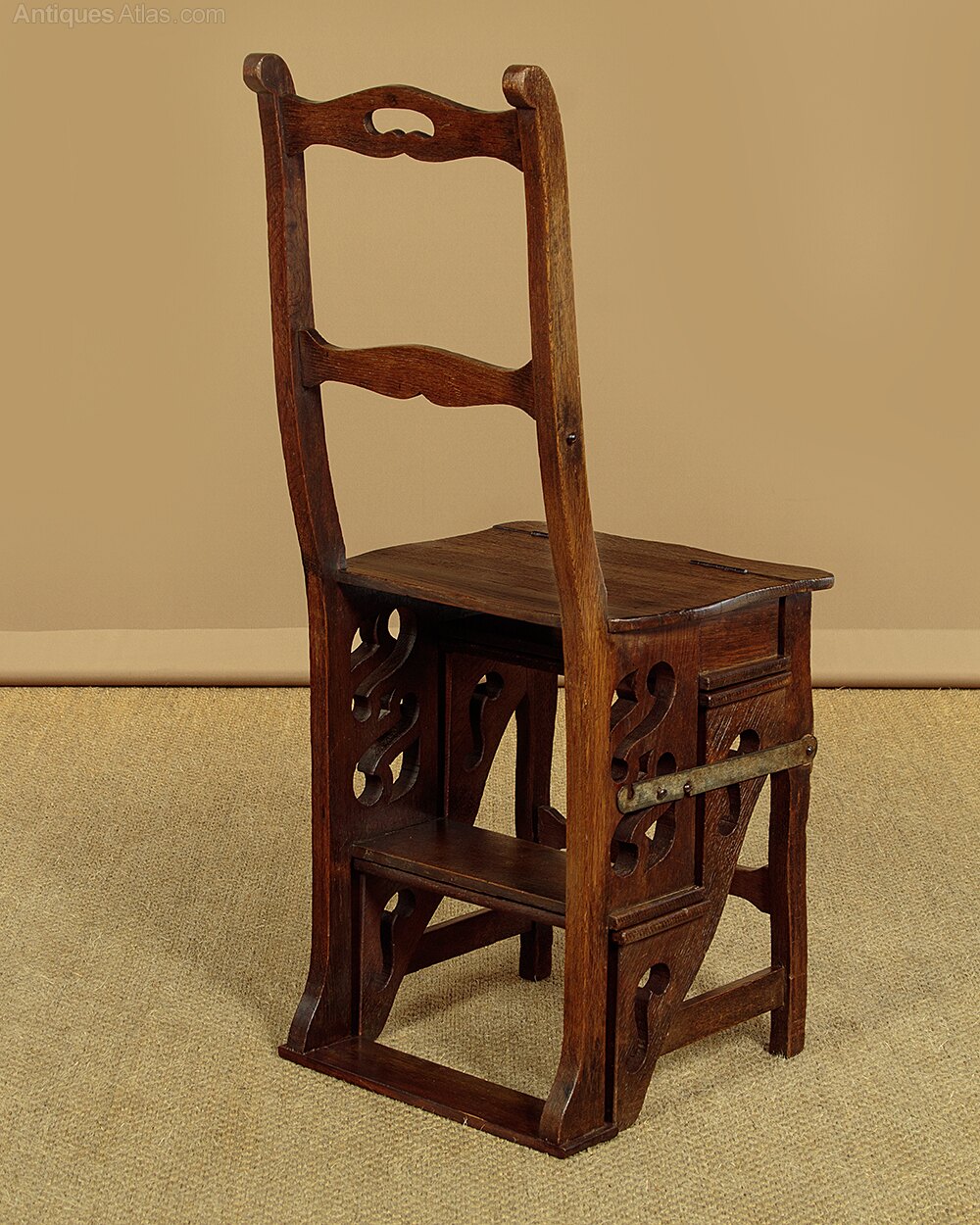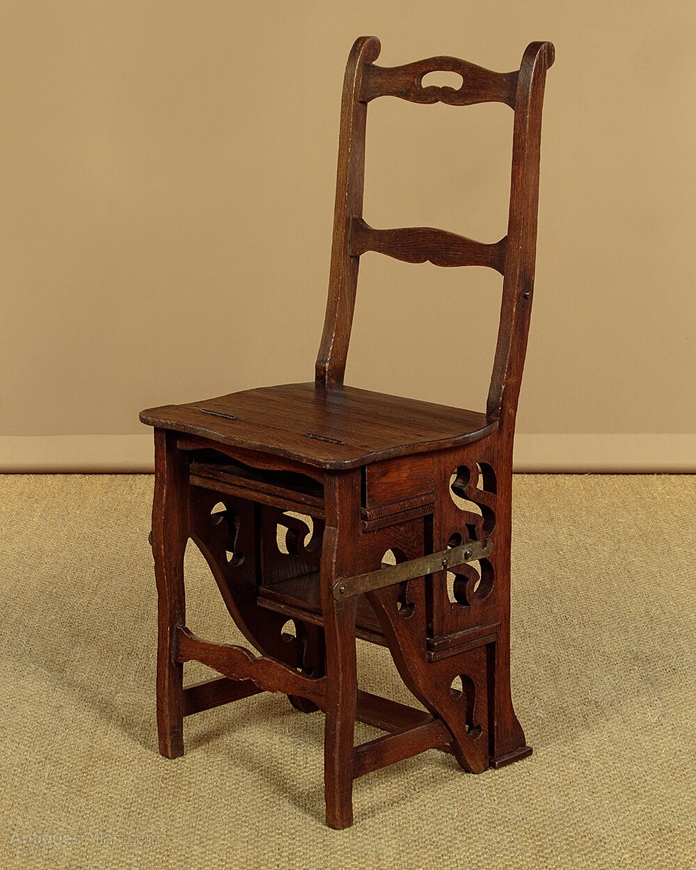 Late 19th.c. metamorphic library steps and side chair in oak c.1880. Slightly curving backrest with shaped stretchers, the top one pierced with a handgrip, over a shaped seat. Backrest and seat fold over to form a set of library steps with four steps plus a thinner half step to use as a handle. The top full step is 31" from the ground. Usual pierced decoration to the sides, shaped front legs and stretcher. Iron hinges and metal locking stays to both sides. Very good colour and condition, cleaned and waxed in our workshops.