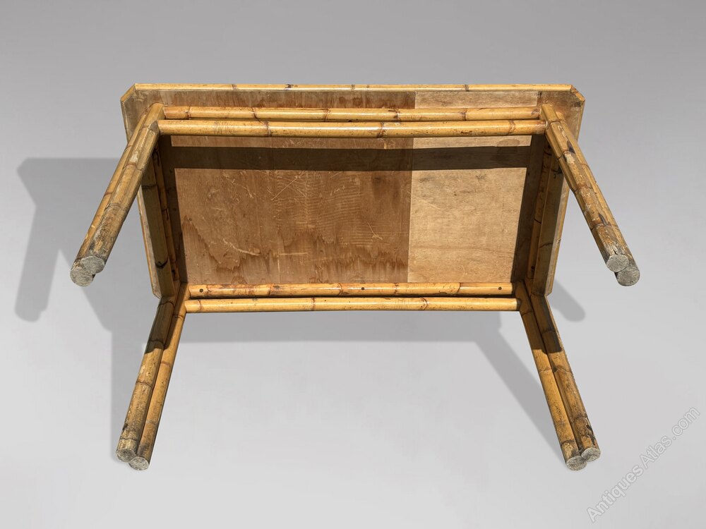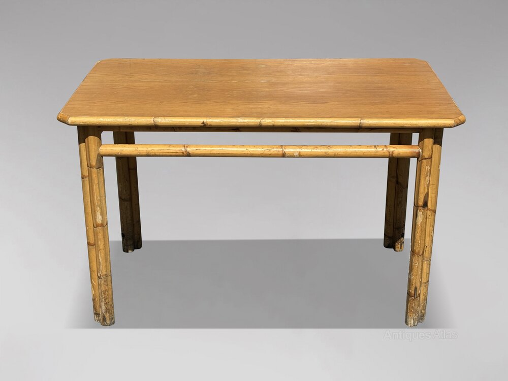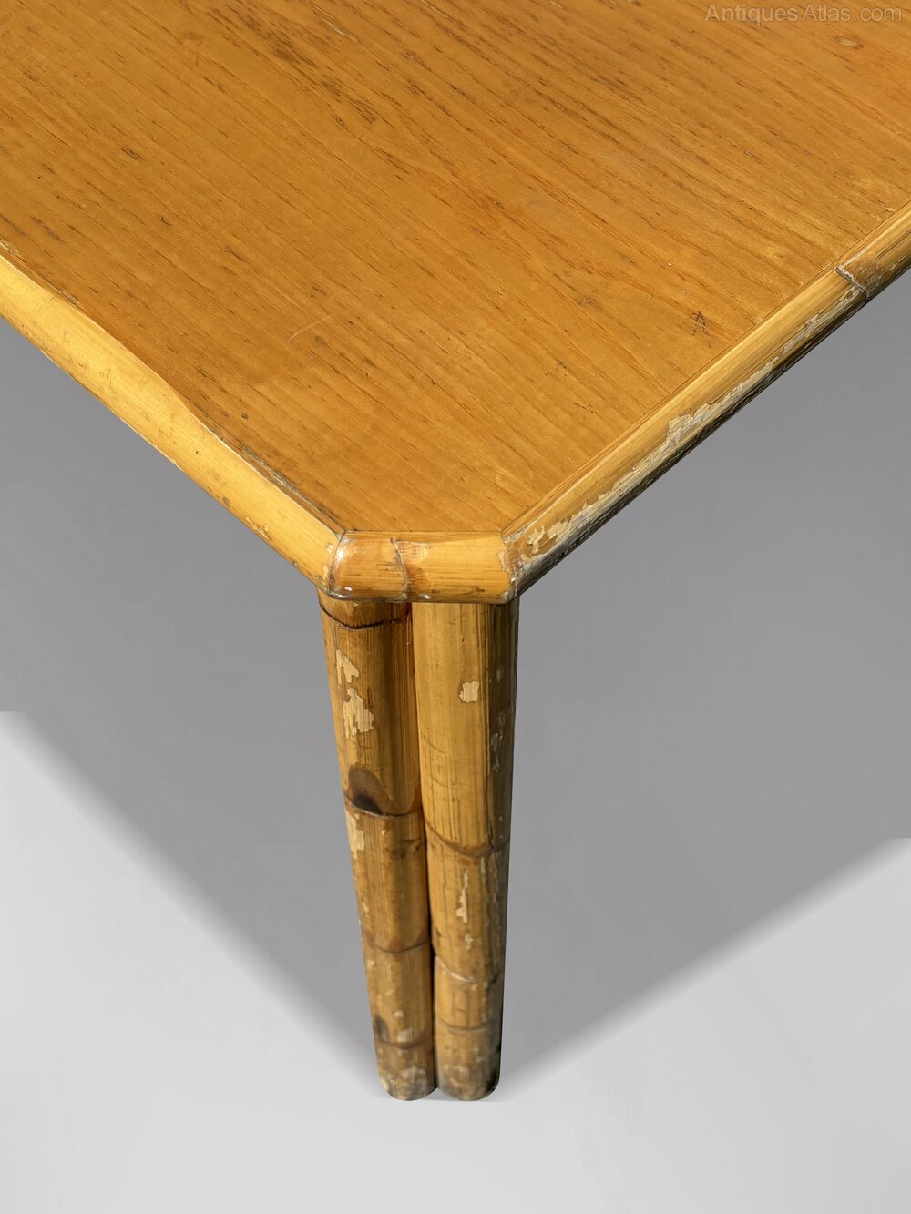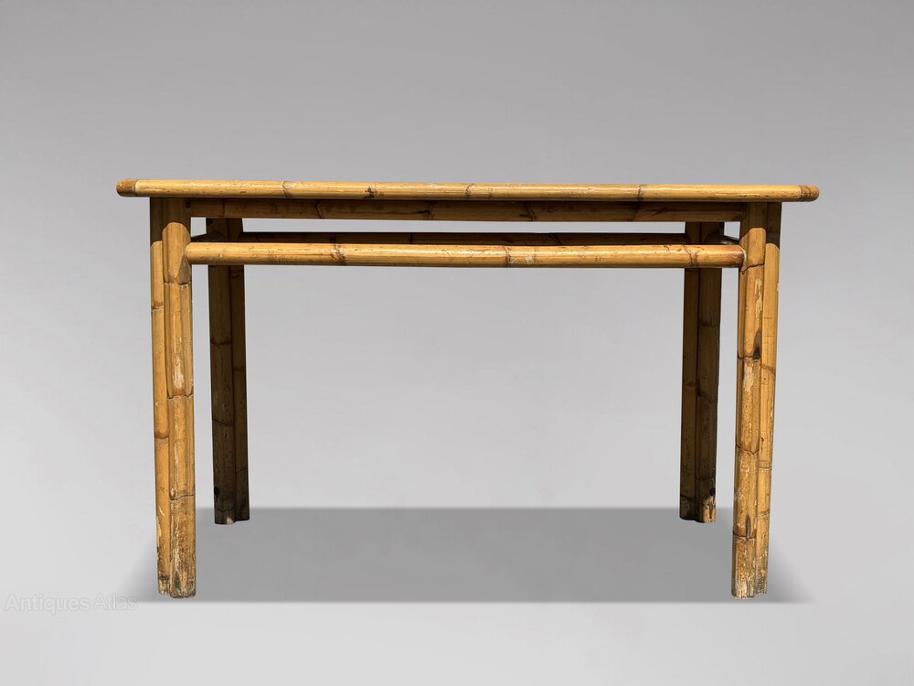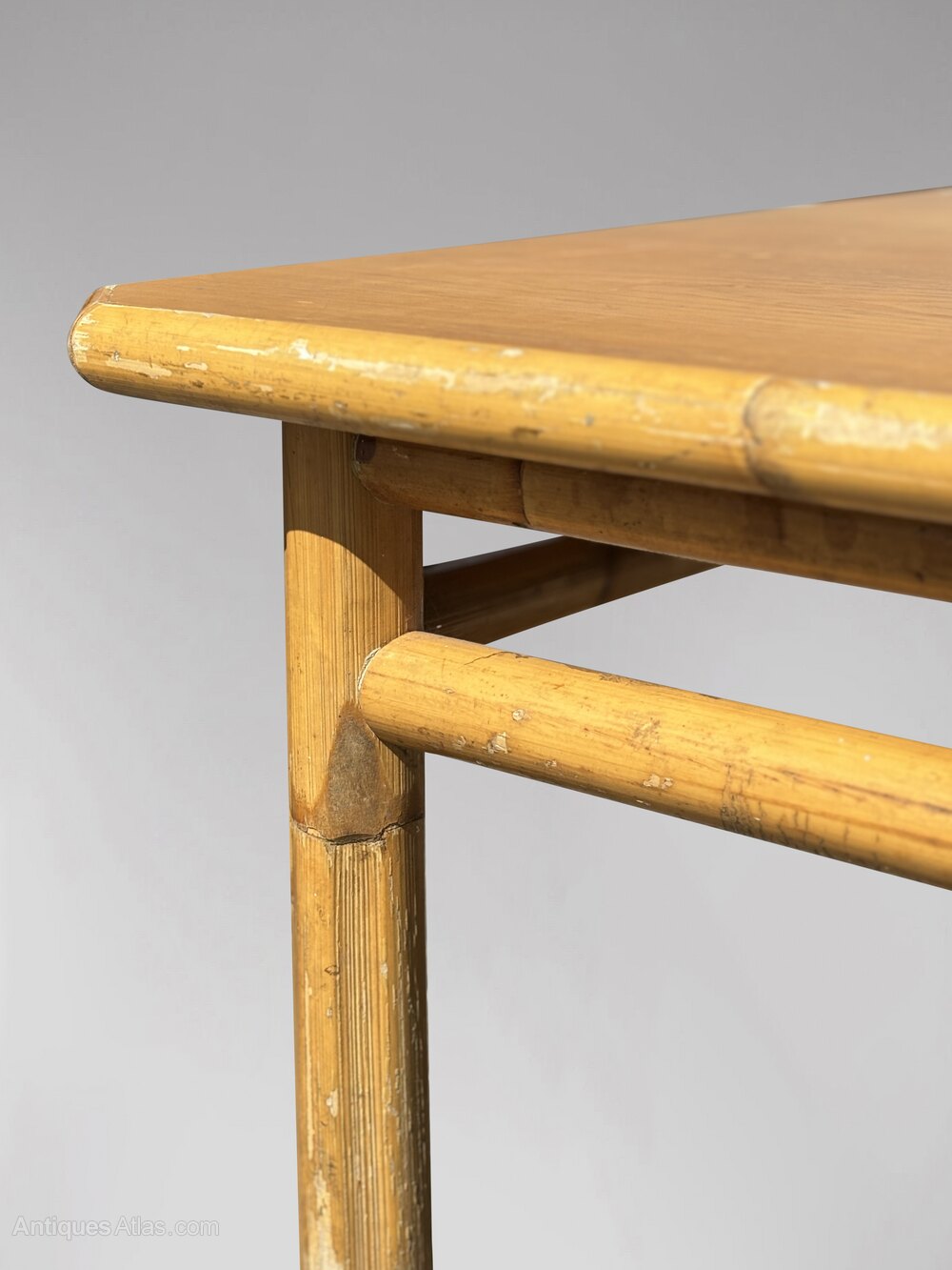 This mid-20th-century French Riviera bamboo dining table features a rectangular bamboo frame. The table showcases a lovely colour and patina, contributing to its charm. The design is both elegant and exceptional, making it a perfect addition to any living space. Manufactured in the South of France during the 1960s, this table boasts beautiful details and perfect proportions, ensuring both style and durability. It is robust and in very good condition, with only normal minor wear to the wrapped edges of the rattan, which does not compromise the overall structure. This table is a timeless statement piece, ideal for adding a touch of sophistication to your decor while providing a functional surface. Acquired from a local restaurant near Valbonne that recently closed, there are six of these tables available.