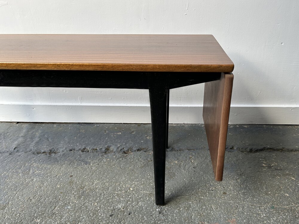 A unique Mid-Century coffee table with an extendable top, made by English manufacturer Nathan. The tabletop slides along the frame, allowing an extra black melamine surface to be lifted for use or lowered when not needed. Please ask if you would like to see a video of this in action.