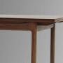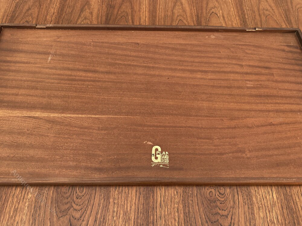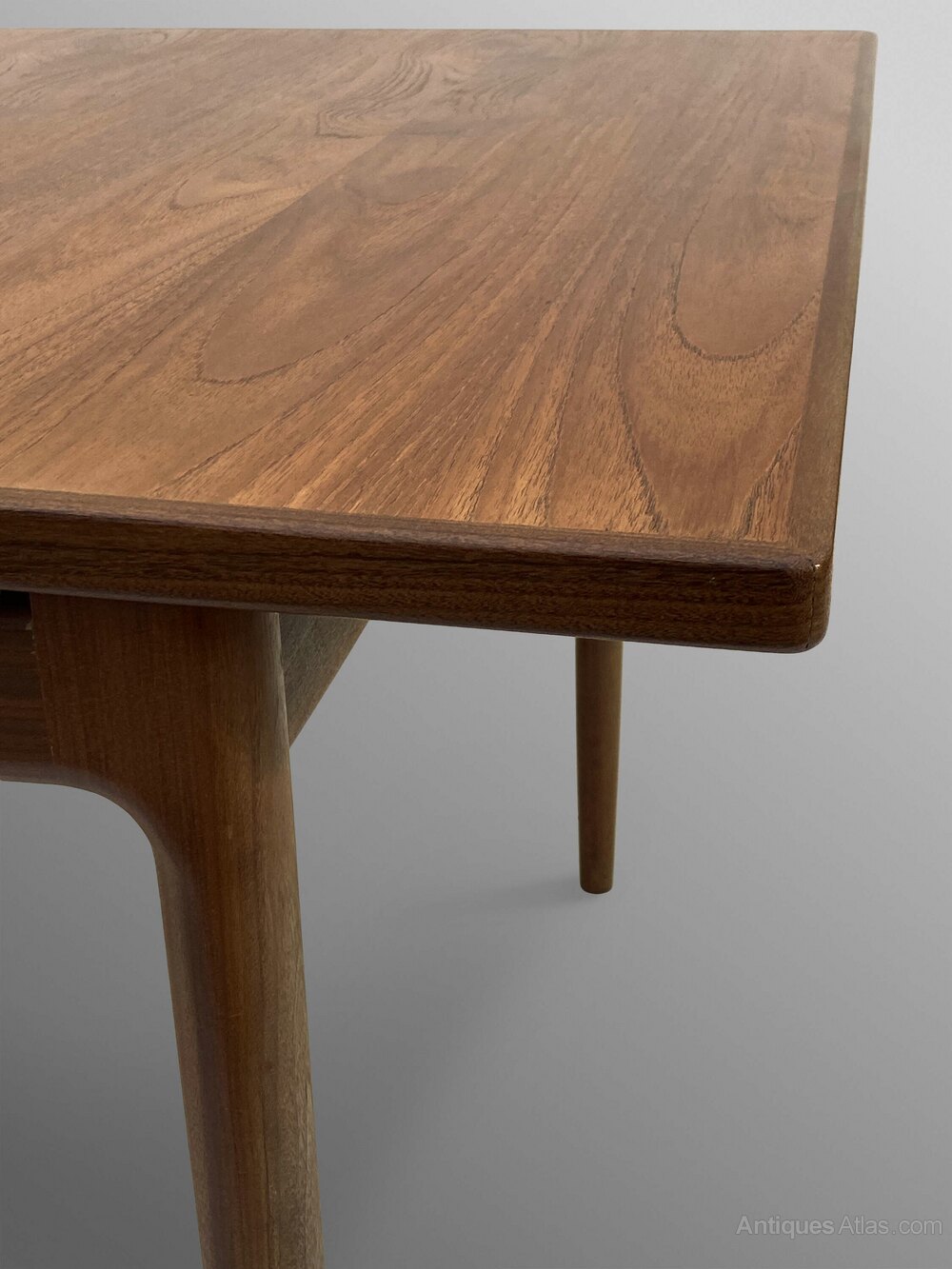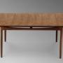 This mid-century teak extending dining table is designed by Ib Kofod-Larsen for G Plan, dating back to the 1960s. The rectangular tabletop features two extension leaves that conveniently store beneath the surface, allowing the table to extend and comfortably accommodate up to ten people. Its tapered legs and sculpted apron add to its elegant profile, while the beautifully grained teak enhances its warm, organic look—characteristics that reflect Kofod-Larsen's refined Danish design style for G Plan.
