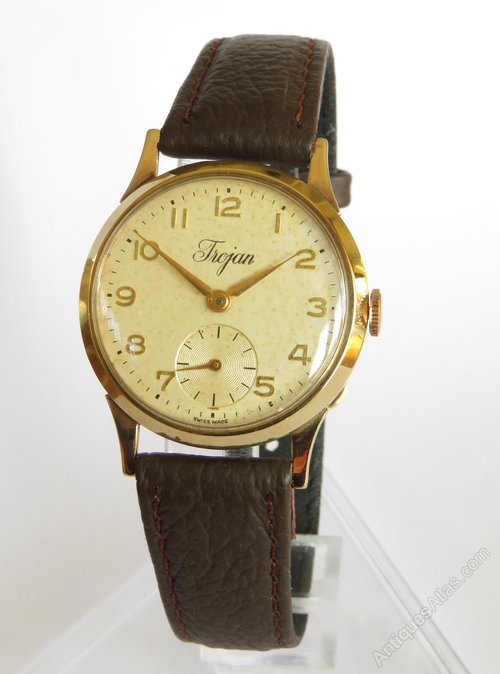 The brand name Trojan was registered several times but this is likely to be from The Crown Manufacturing Company who were based in Leeds. They would have imported the movements from Switzerland, and then finished and cased them in readiness for wholesale.