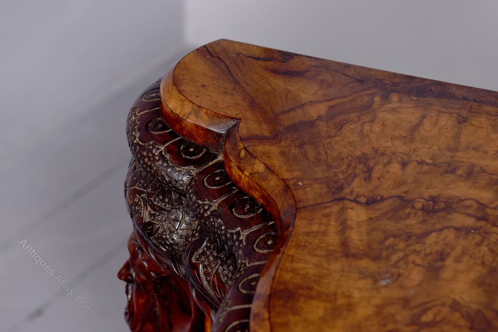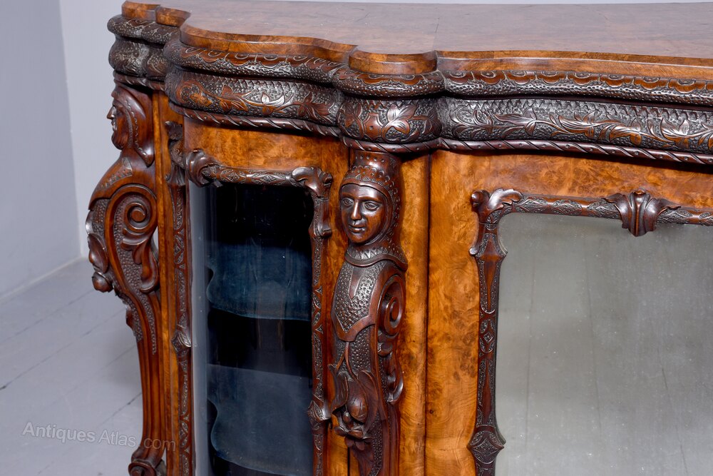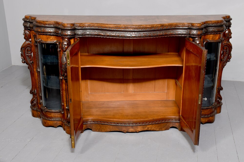 Circa 1860. A mid Victorian profusely carved serpentine fronted credenza, the top in the fine book matched burr walnut with a simple fore-edge and profusely double carve frieze including patterns and foliate carving, the front with a pair of shaped mirror doors with proud carved beading, the ends with a pair of serpentine glazed doors, the doors are intersected by carved plasters which include the head of a knight with foliate carved and pierced sides finishing with a scrolling section, all resting on an enclosed carved base with foliate carving on the top and a shaped apron beneath.