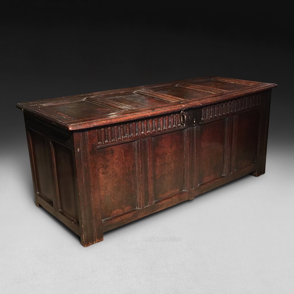 A good mid 17th century Oak four panel Coffer, the hinged four panel lid above a fluted frieze and four panel front, the sides with two panels each and the back again four panels, all raised on the original stiles.