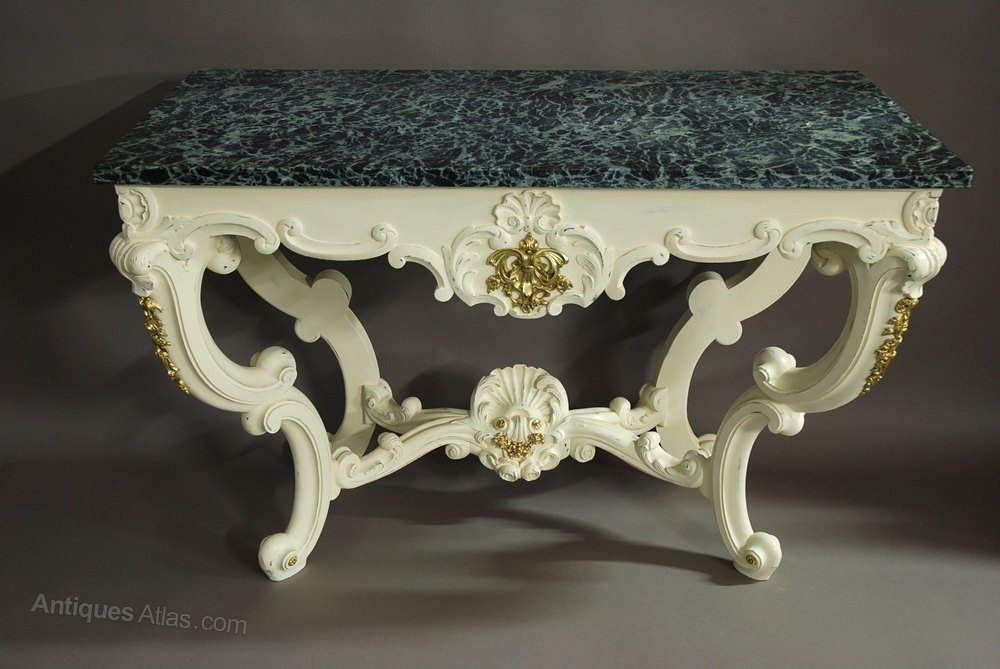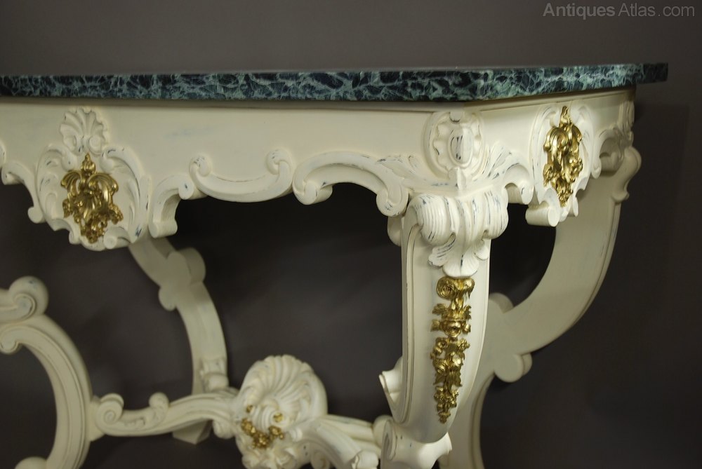 The base, of typical Rococo style, consists of a scrolling, carved front rail with central scallop decoration with ormolu mount - this same design & decoration is also replicated on the sides of the table.