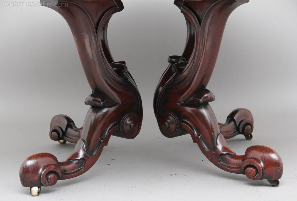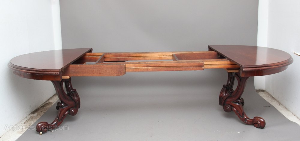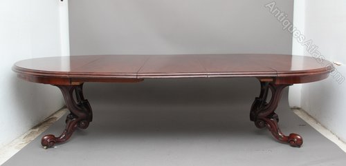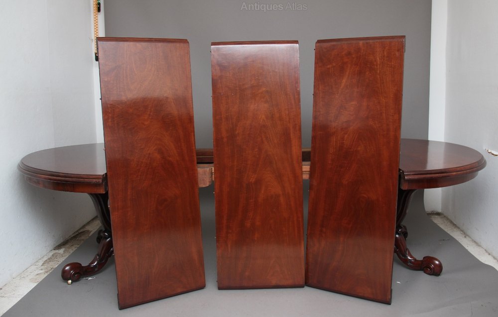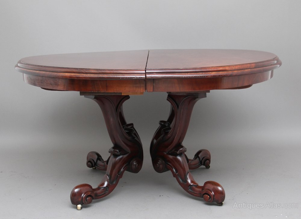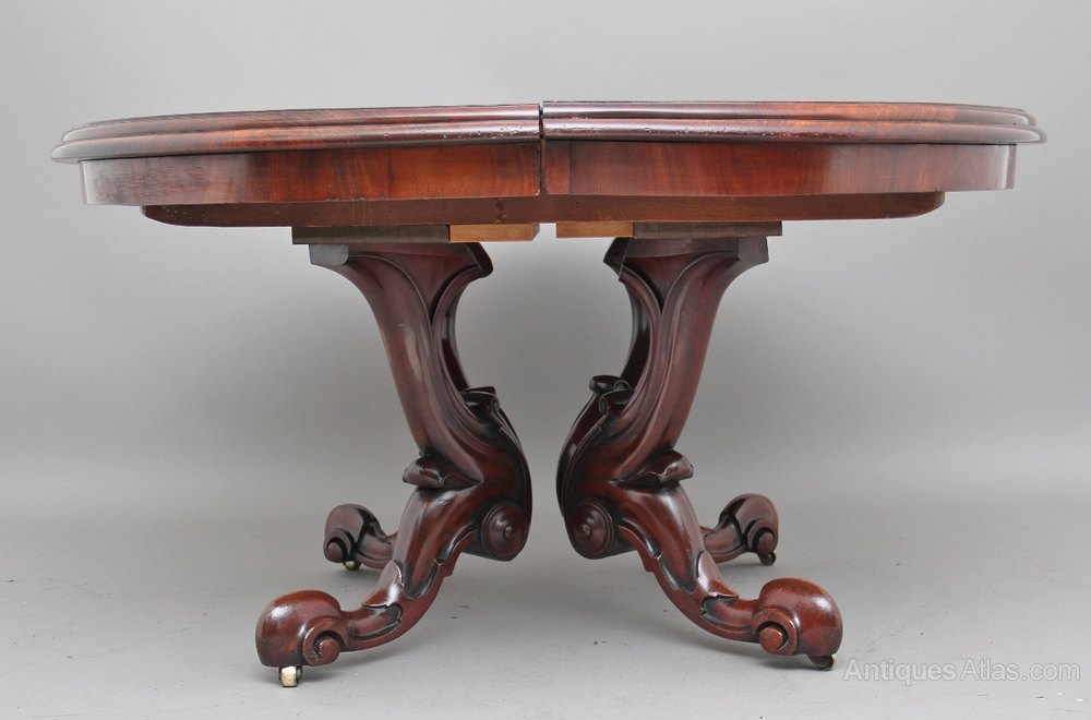 Mid 19th Century mahogany dining table with three leaves, staring at 54” dia (137cms dia) extending to 111” (282cms) having a lovely figured top with nice moulded edge supported on an unusual carved and swept base. Fantastic colour and in great condition, a very practical table. Circa 1850.