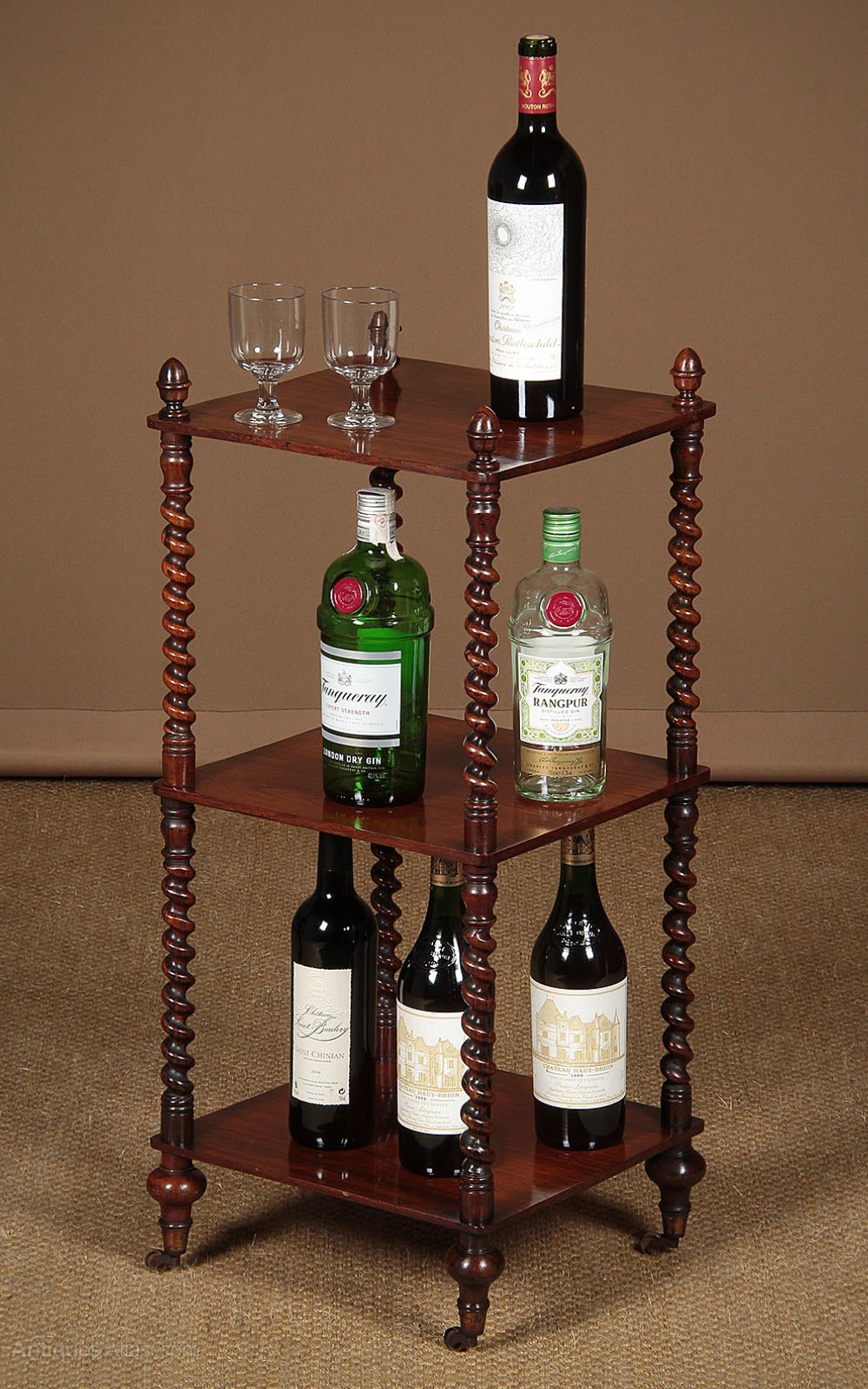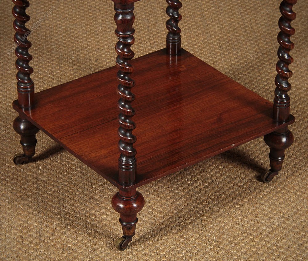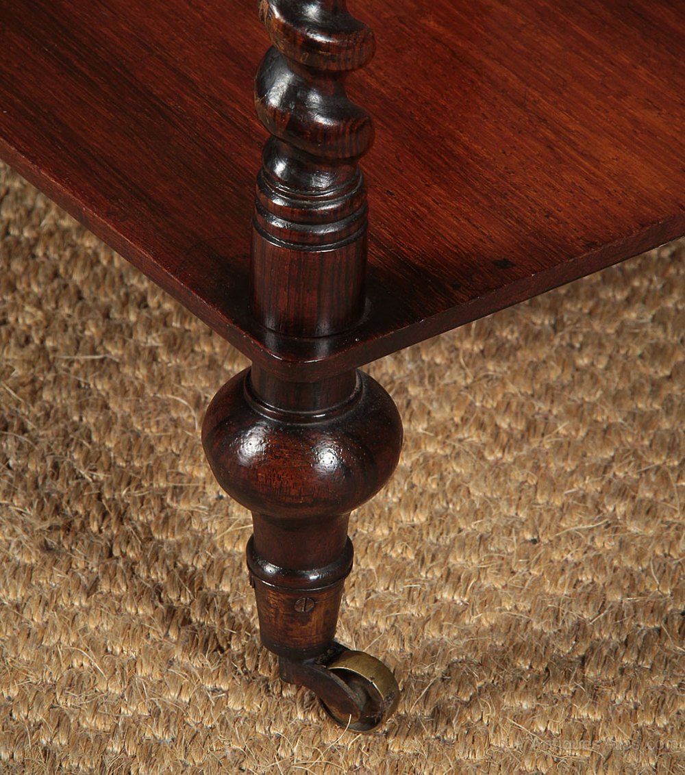 Charming little mid 19th.c. rosewood three tier what-not or side table c.1860. Three 14″ x 13″ shelves on fine twist carved columns with turned finials and feet raised on the orignal neat little brass cup castors. Superior quality in solid rosewood throughout. Excellent colour and condition, cleaned and waxed in our workshops.