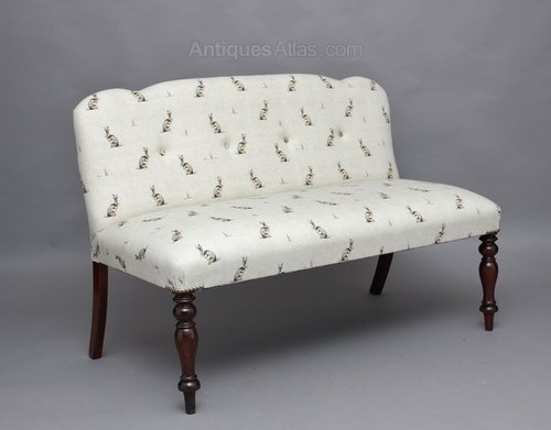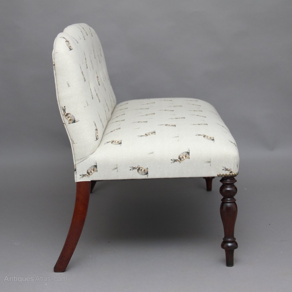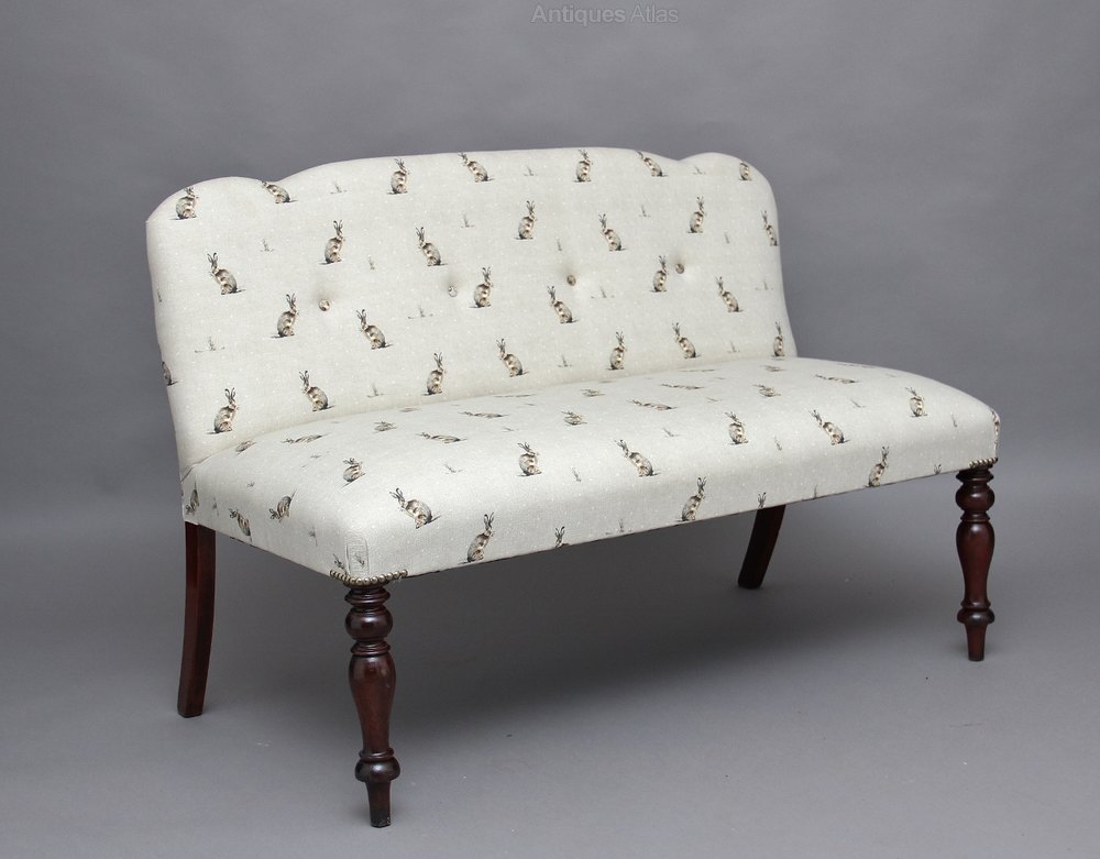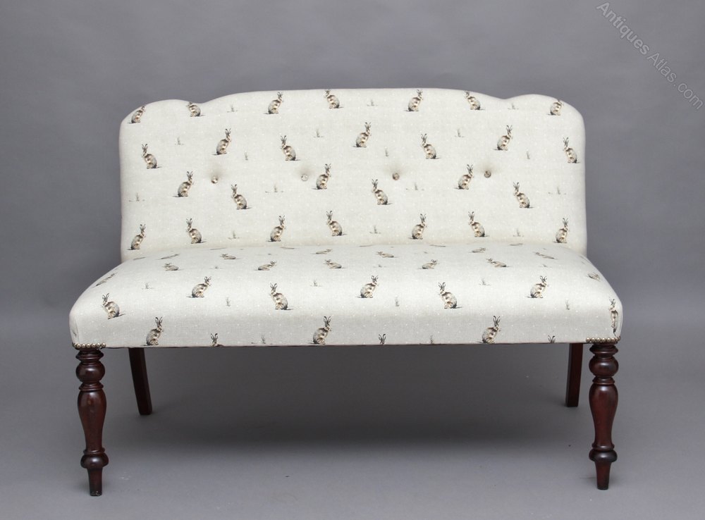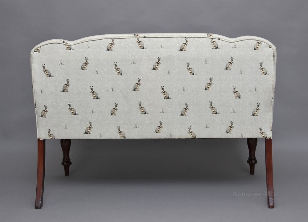 A mid 20th Century bench upholstered in a cream coloured fabric decorated with hares, the bench having brass stud decoration, with nice turned mahogany front legs and out swept legs to the rear. Circa 1960.