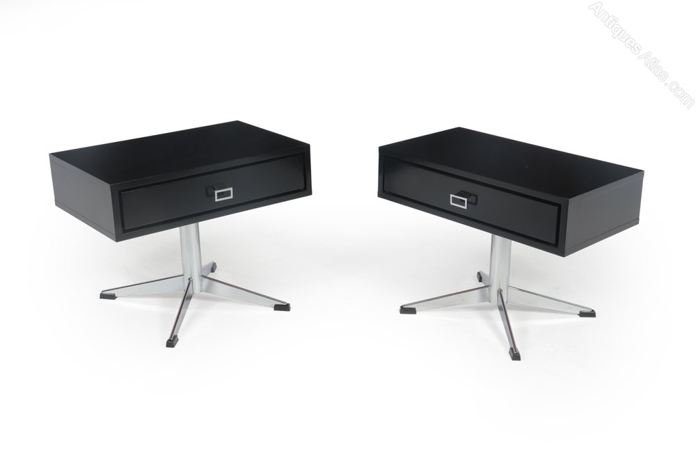 A pair of mid century modern bedside antique tables, ebonised black top with single drawer standing on a four legged base excellent condition throughout