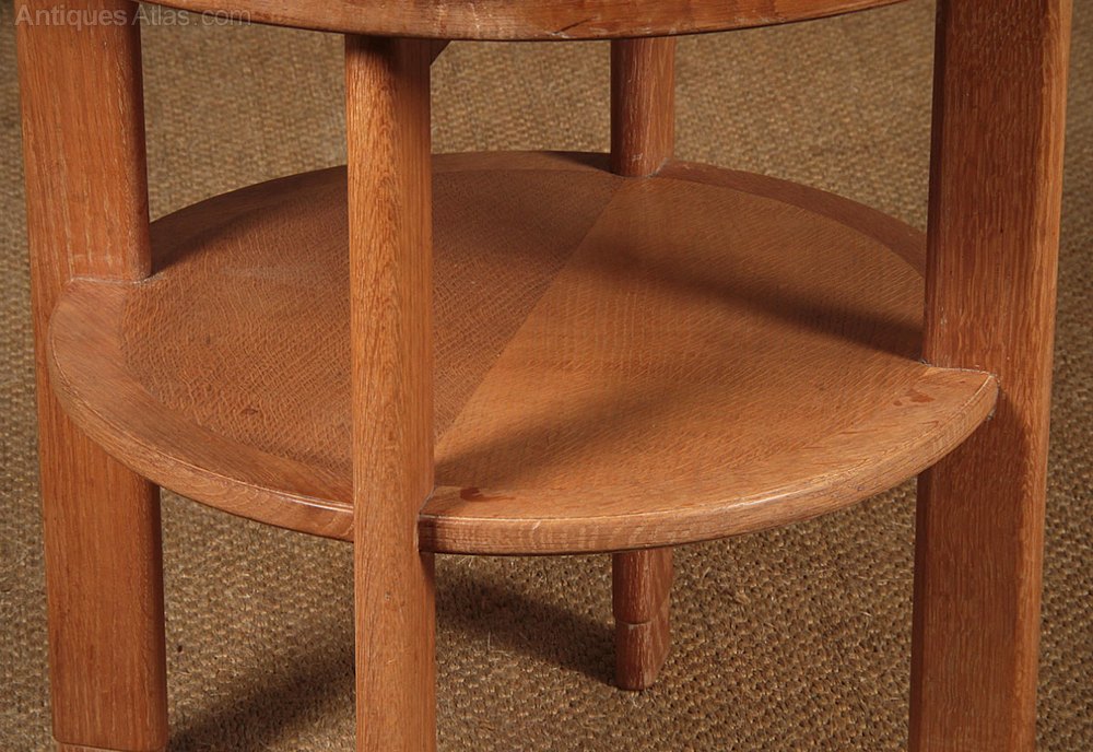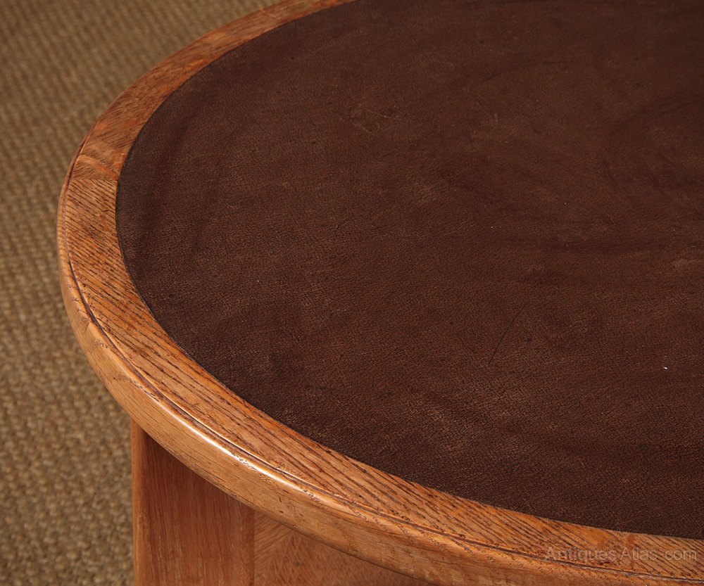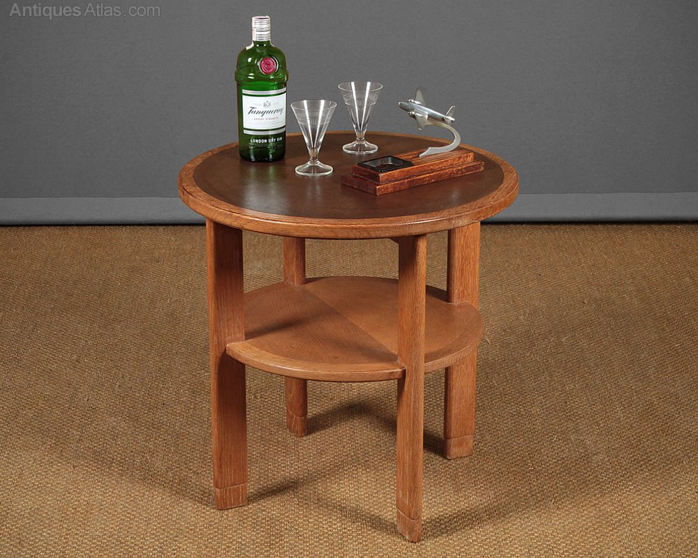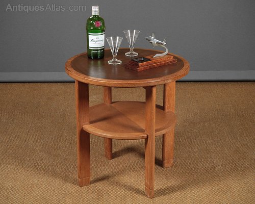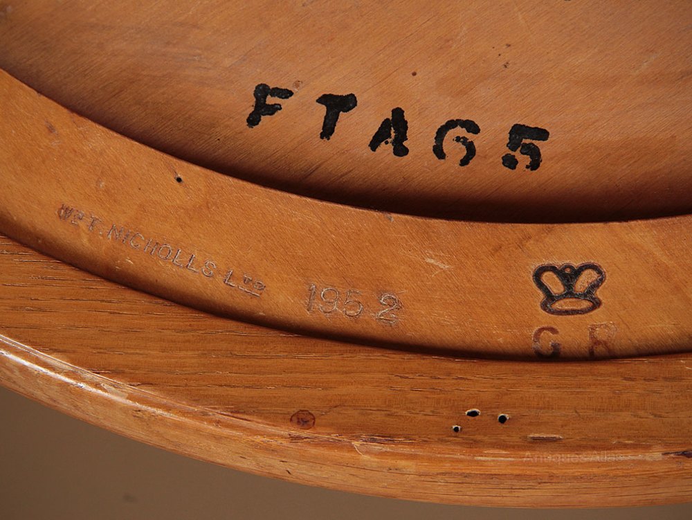 Interesting little mid 20th.c. limed oak drinks table, reputedly from the officer’s mess at RAF Valley, dated 1952. 24″ diameter top with a brown leatherette insert within an oak surround. Raised on simple moulded legs joined with a lower shelf. Stamped underneath for the makers W.T Nicholls Ltd and dated 1952 together with the GR crown stamp (for George VI) found on antique furniture commissioned for government and military buildings. Excellent original condition.
