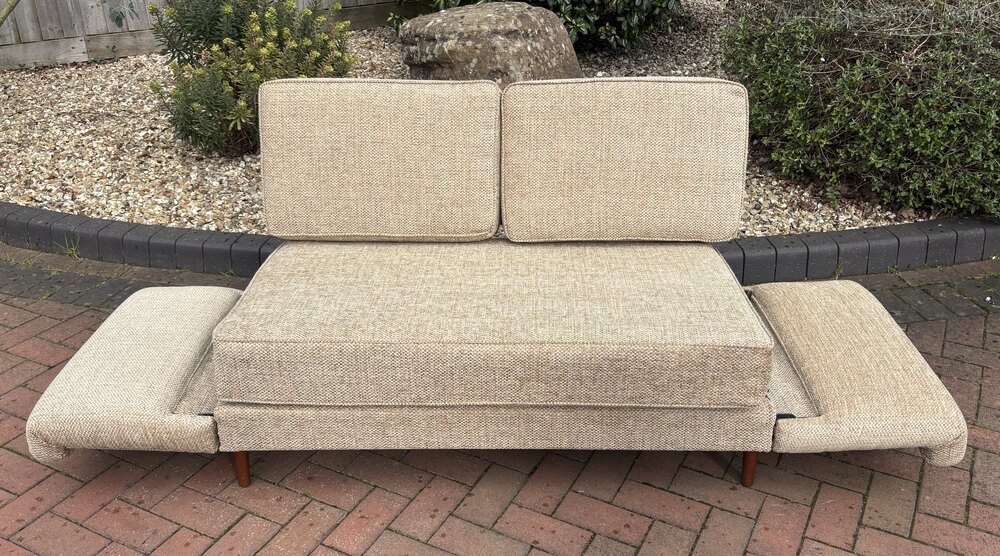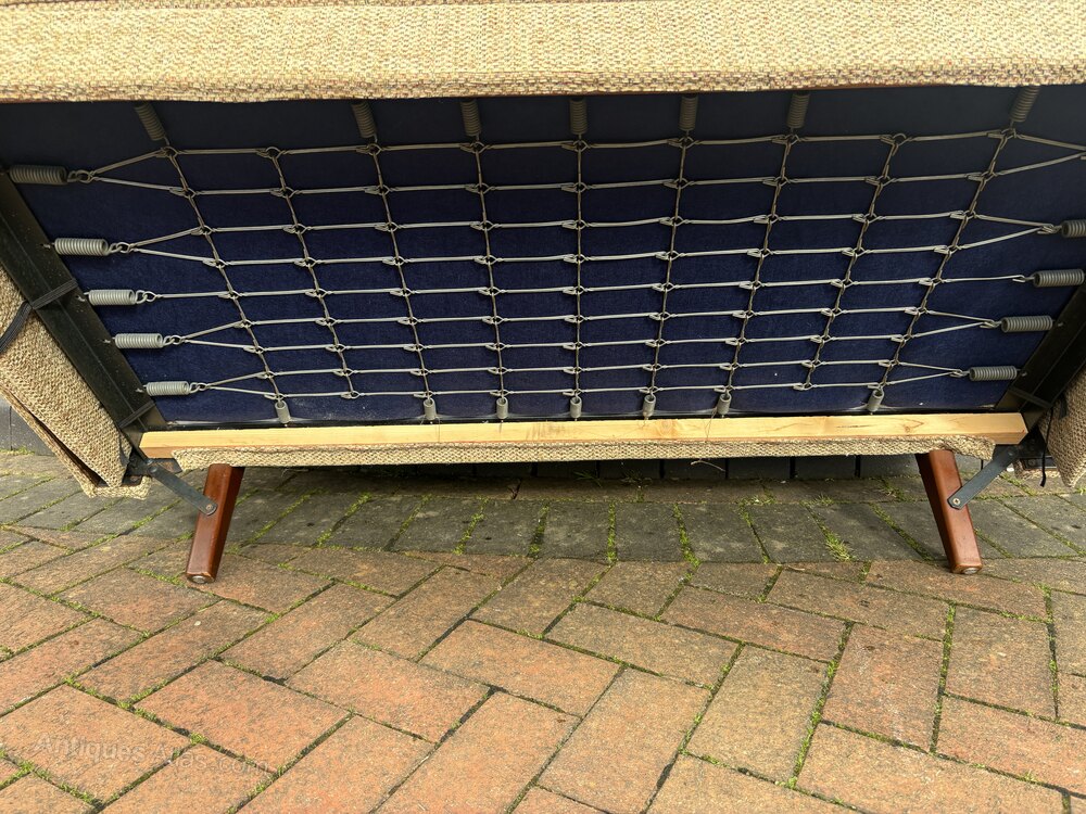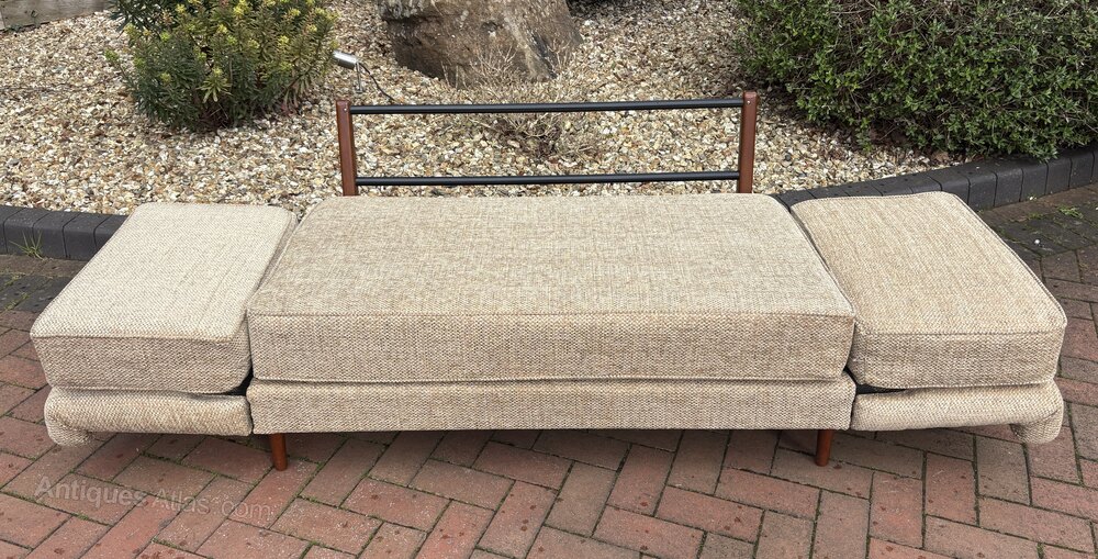 A mid century sofa / day bed c1960's. The sofa has a teak frame, metal back supports and a steel sprung mattress base. The armrests lift up and drop down to support the back cushions when converted to a sofa bed / day bed.