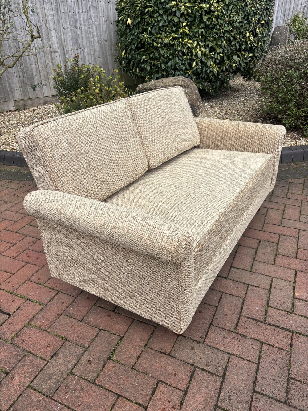 Newly and fully upholstered, taken back to the frame to include new cushions and fabric to meet with fire regulations.