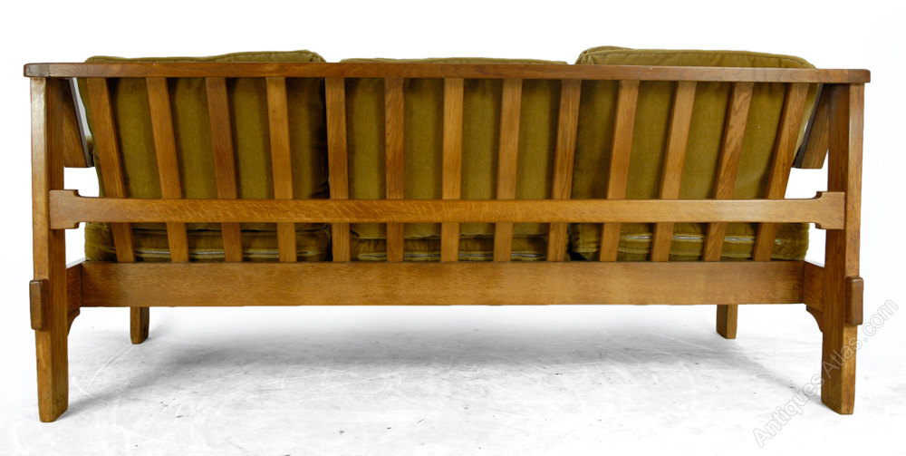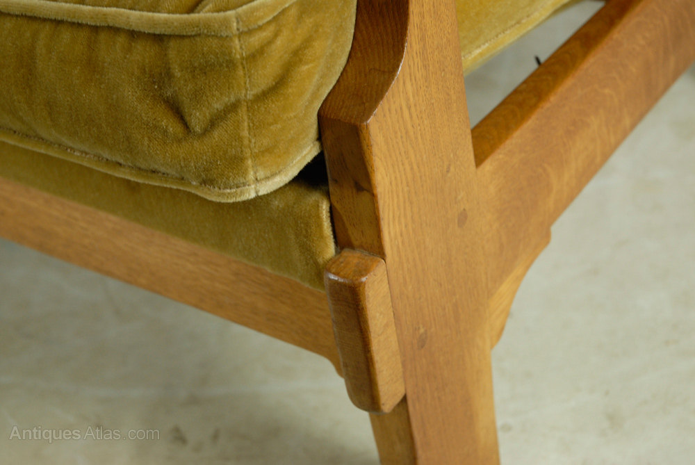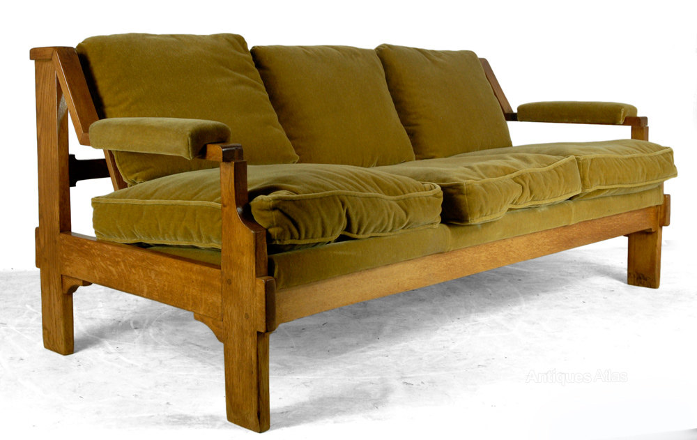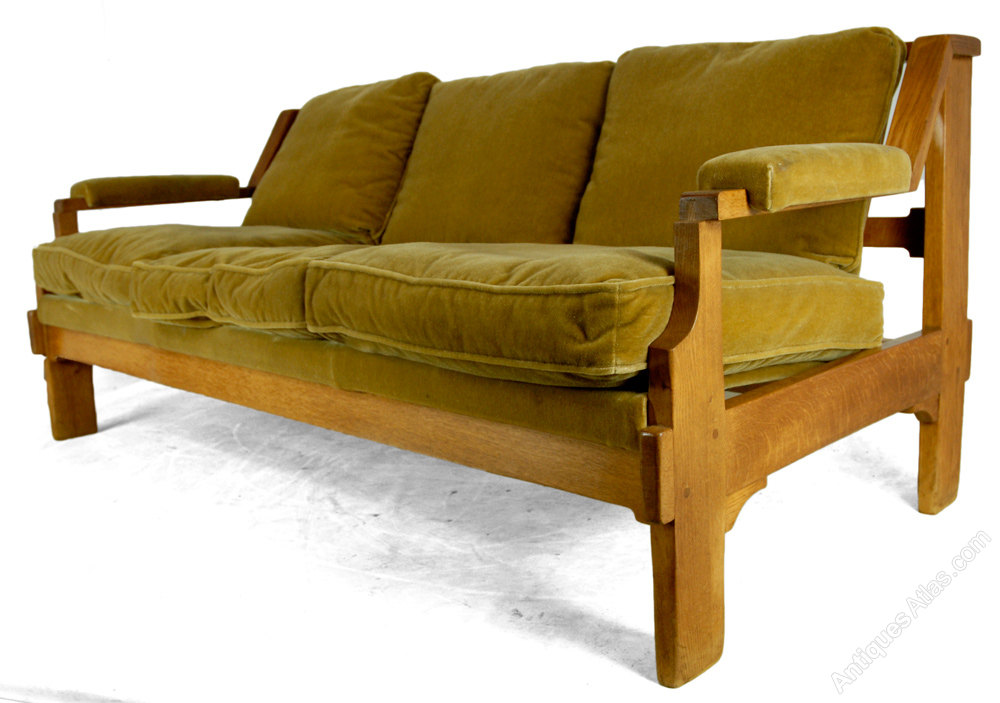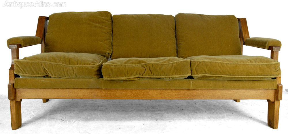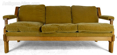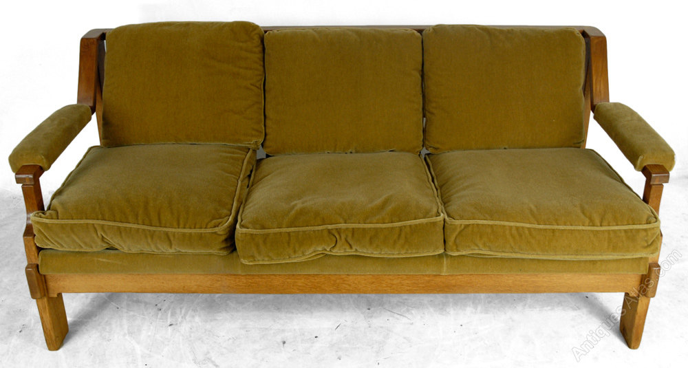 This sofa was produced in Holland in the mid 1960’s having a well constructed quarter cut solid oak frame, all doweled and jointed and good thick original velveteen upholstery they are a good solid sofa.